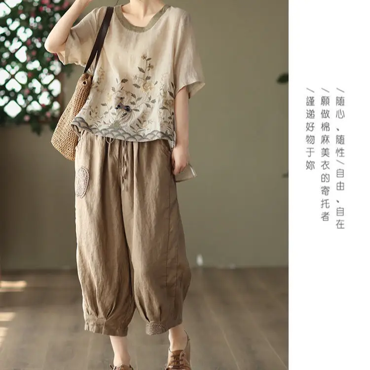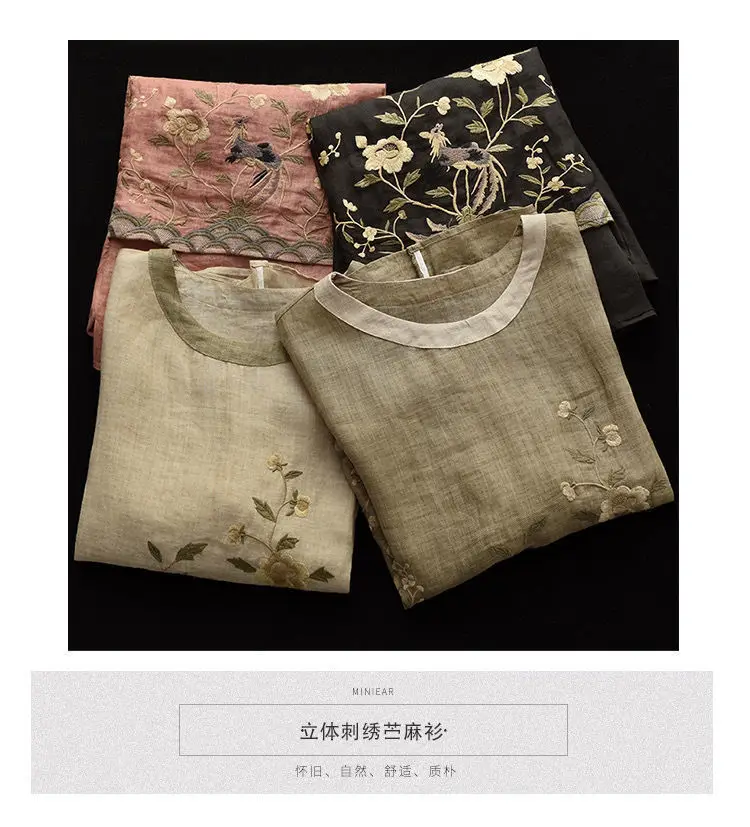 Cotton Linen Embroidered Floral Blouses Women's Chinese Classic Loose Shirt Top Casual Retro O Neck Short Sleeve Summer Shirts