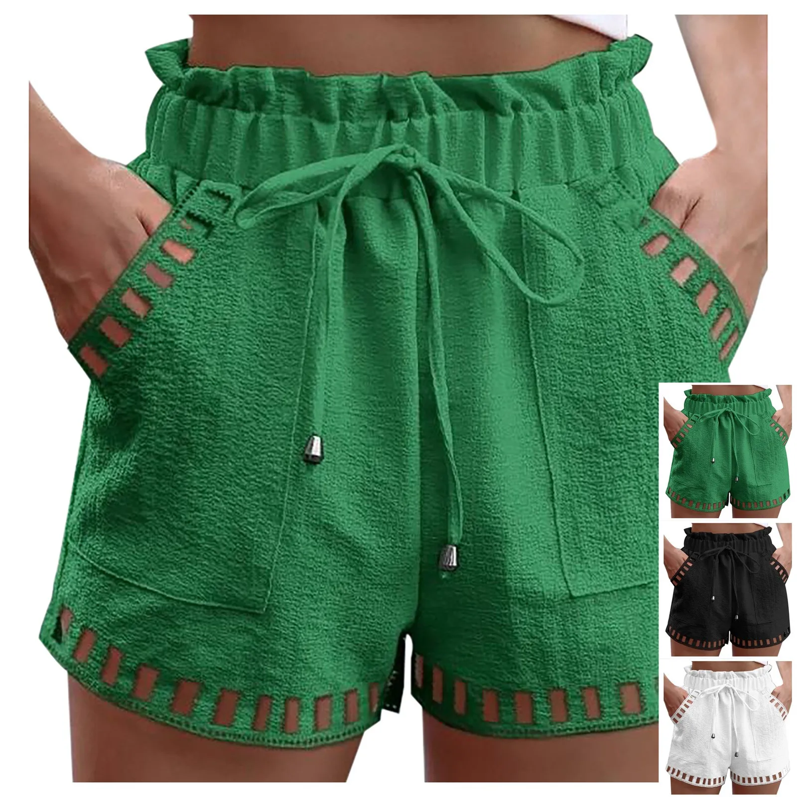 Cotton Linen Shorts Women'S Pants Solid Color Thin Hollow Out Design Trim Pocket Tight Waist Shorts Beachwear White Clothes