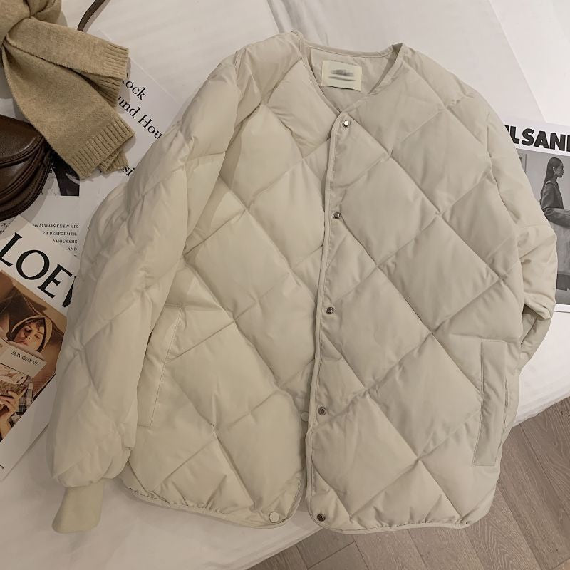 Creamy White Round Neck Cotton-padded Coat Women's Winter Loose-fit Thickened Cropped Puffer Jacket For Petite Women