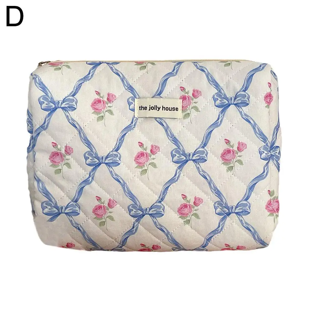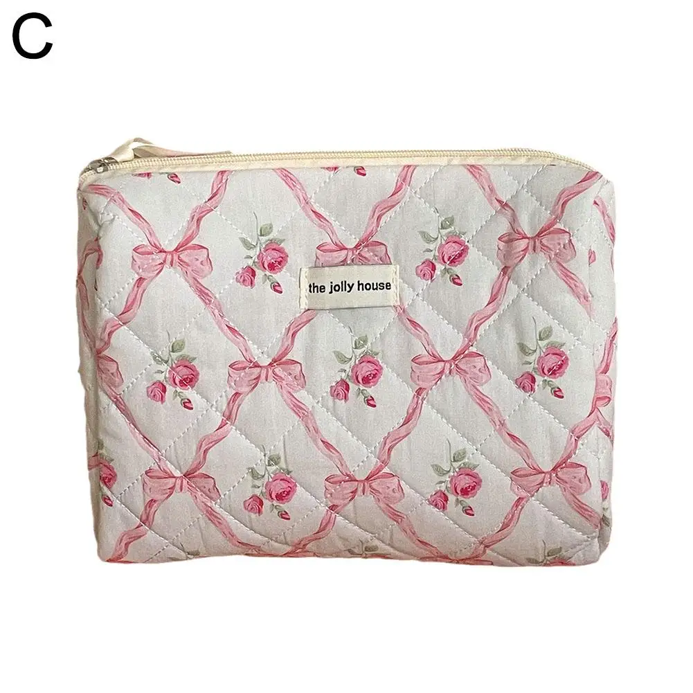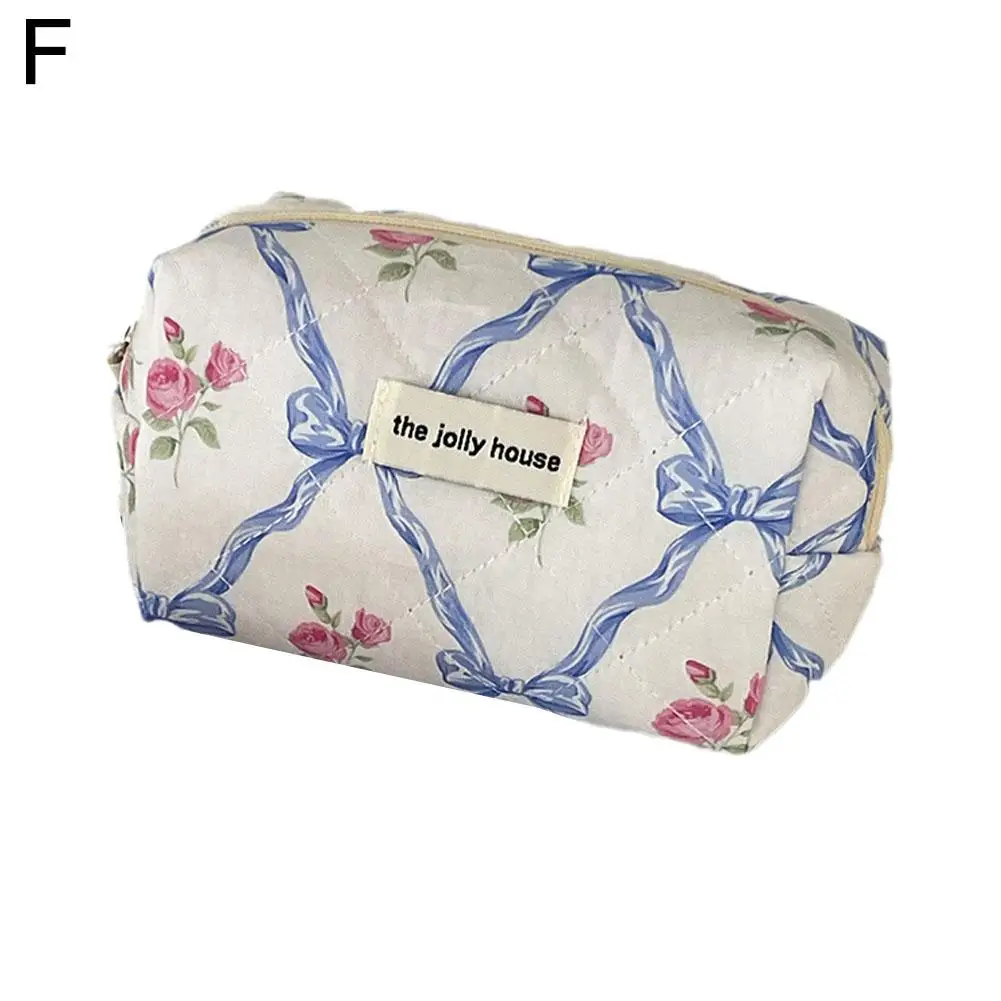 Cute Bow Flower Cloth Handbag Quilting Cotton Makeup Bag Women Zipper Cosmetic Organizer Portable Toiletry Case for Girls