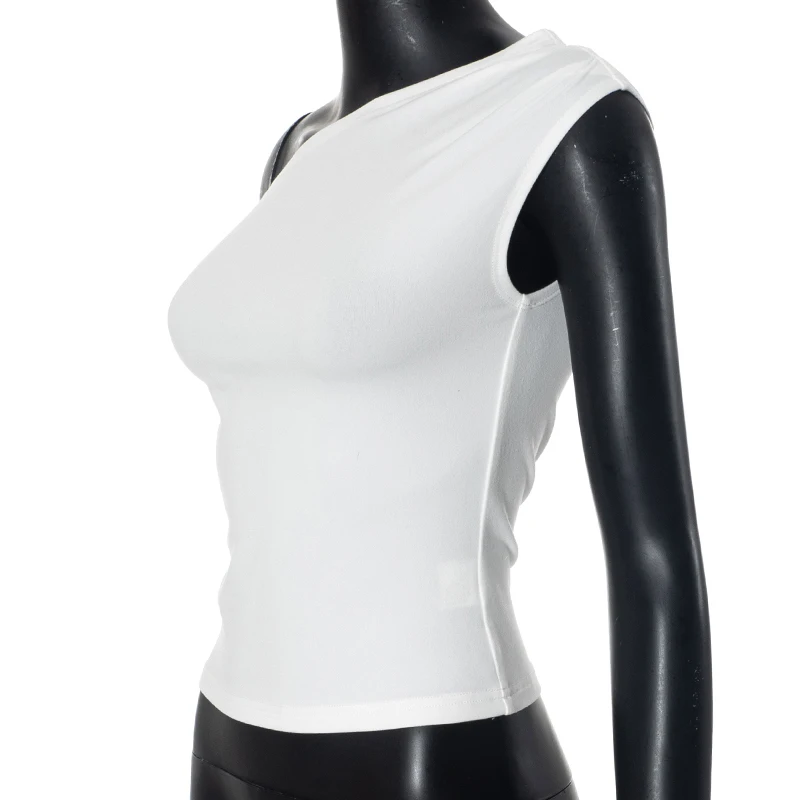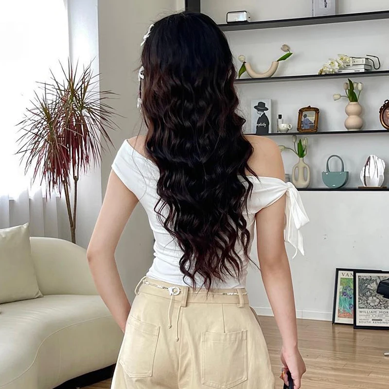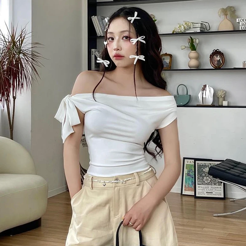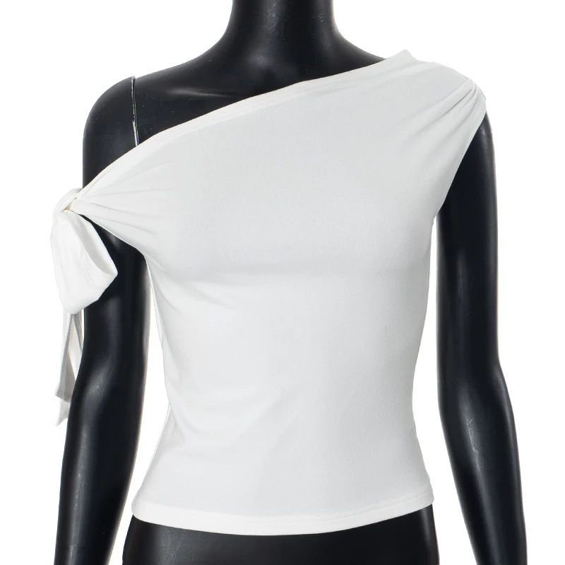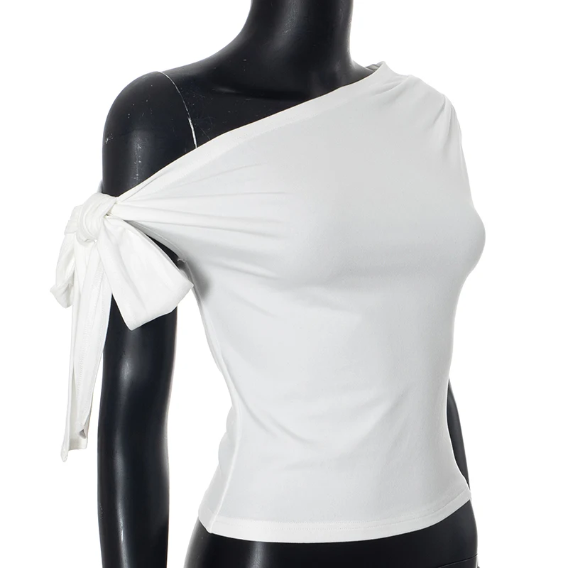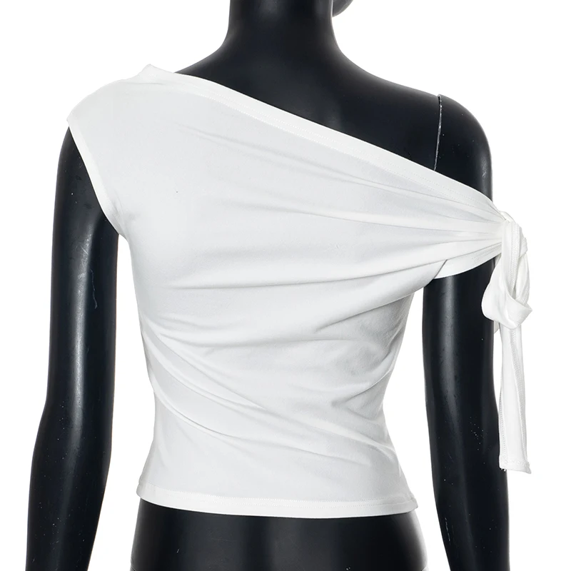 CUTENOVA 2024 Women'S Summer Ins Style New Shrink Pleated One-Shoulder Crop Top Backless Twist Tie Asymmetric T-Shirt Casual Top