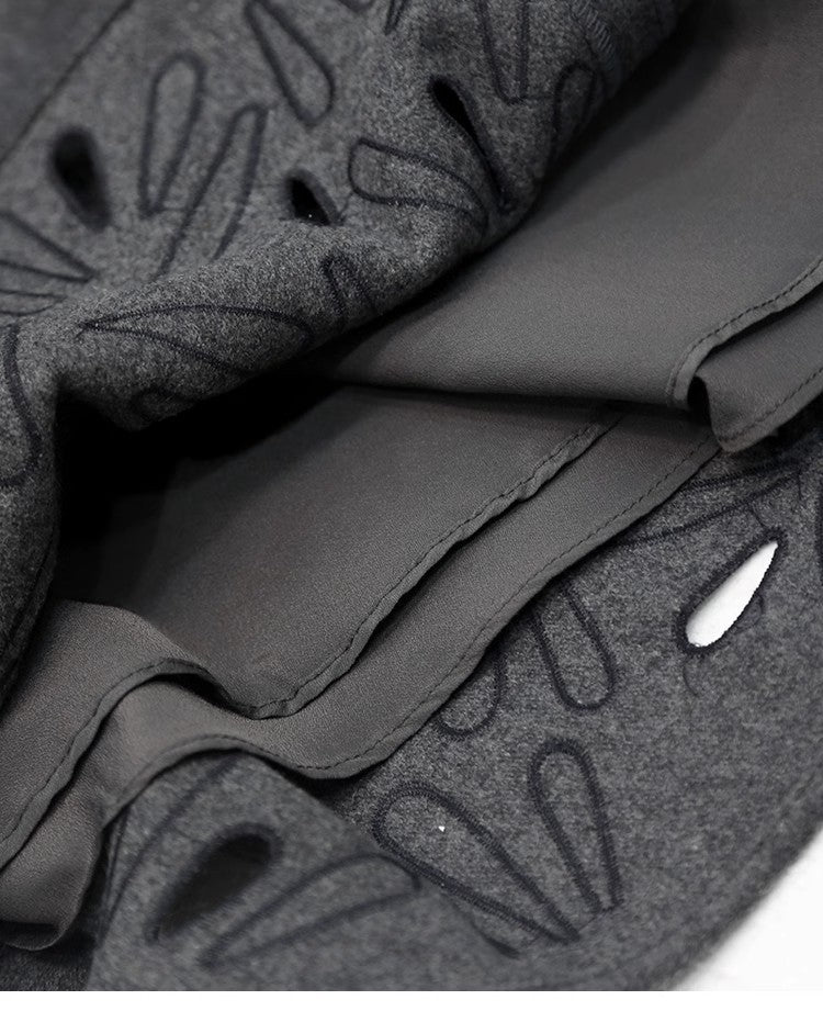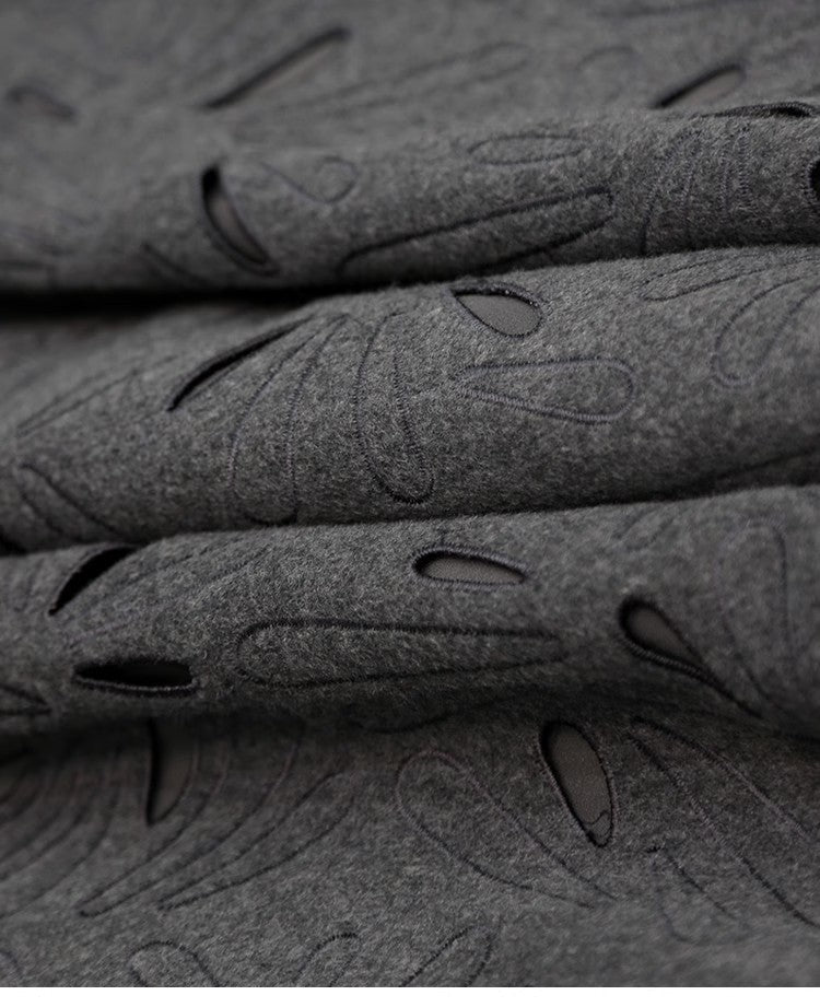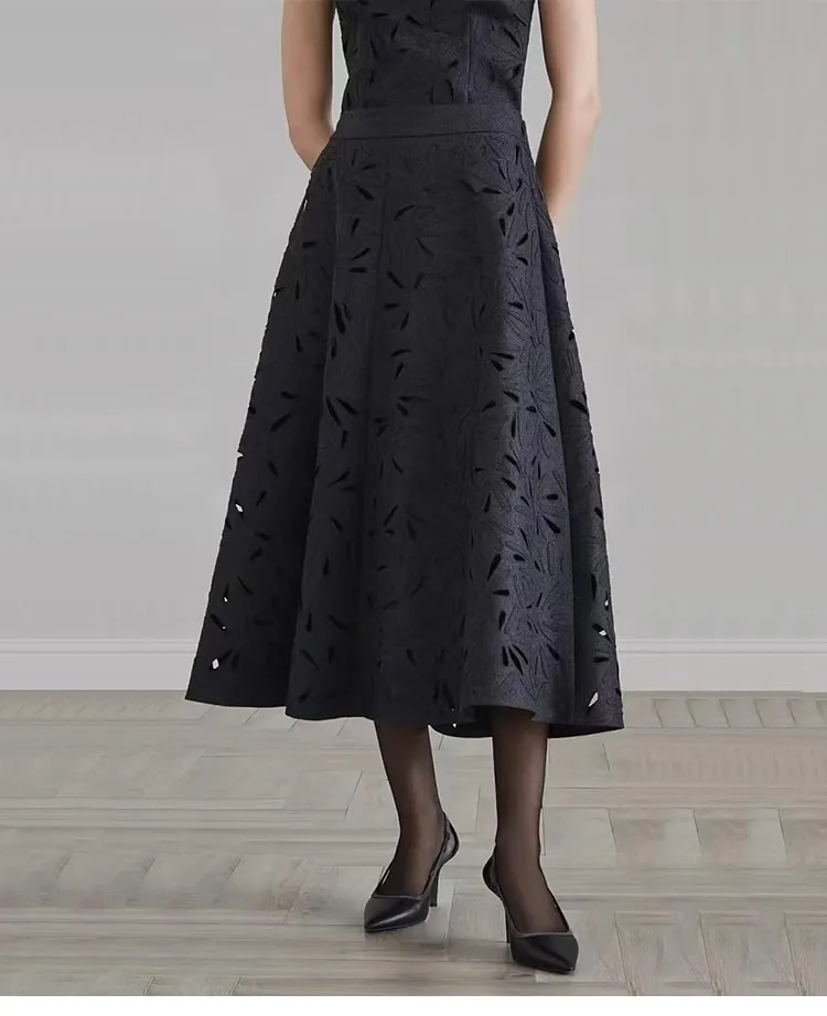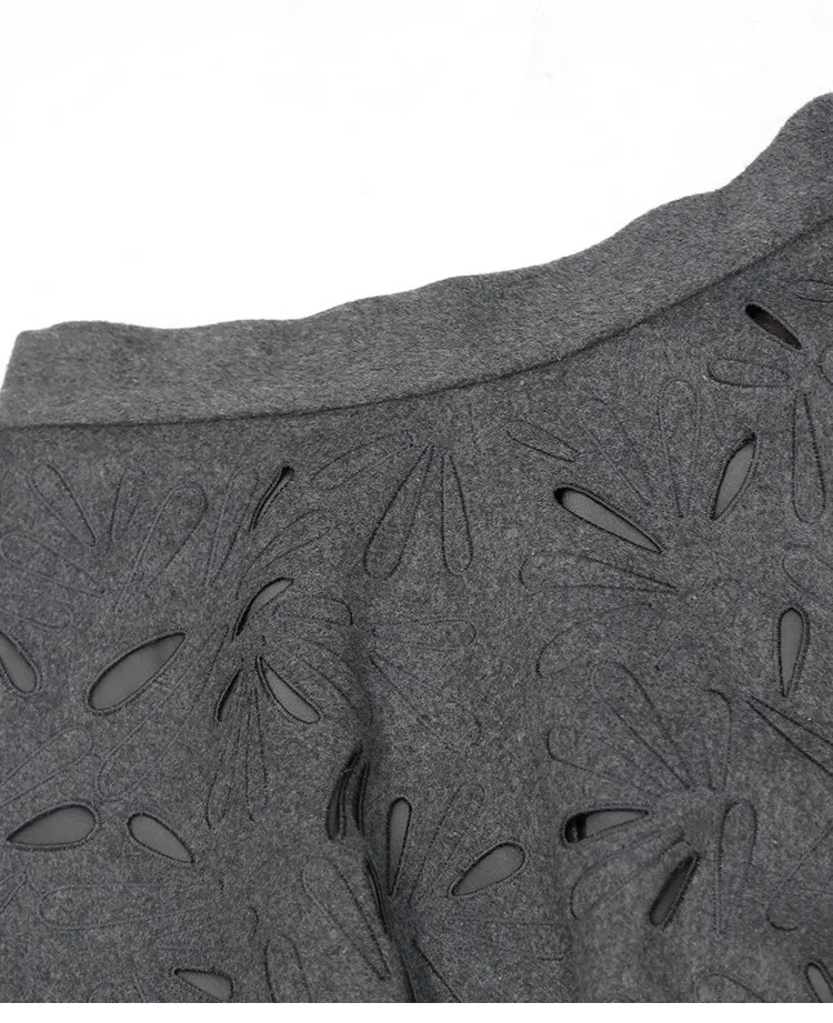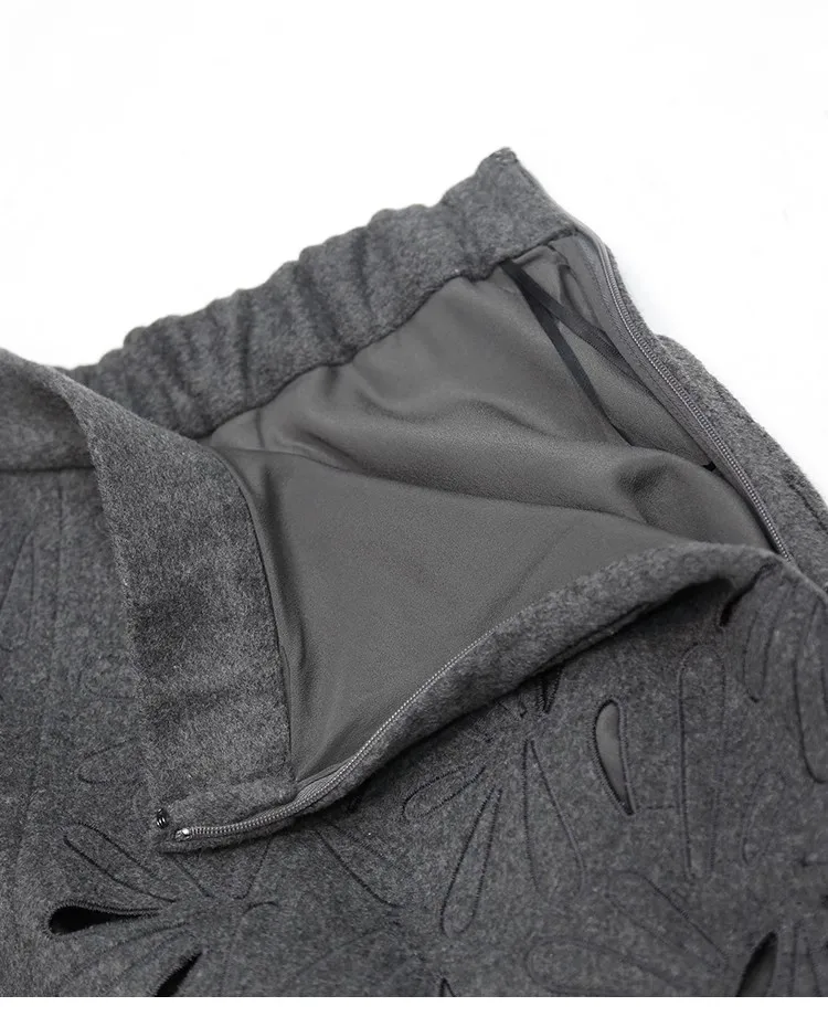 Dark Grey Wool Skirts for women 2024 Autumn Winter Big Swing A-Line Long Skirt Elegant Elastic waist Zipper Hollow Out Skirt