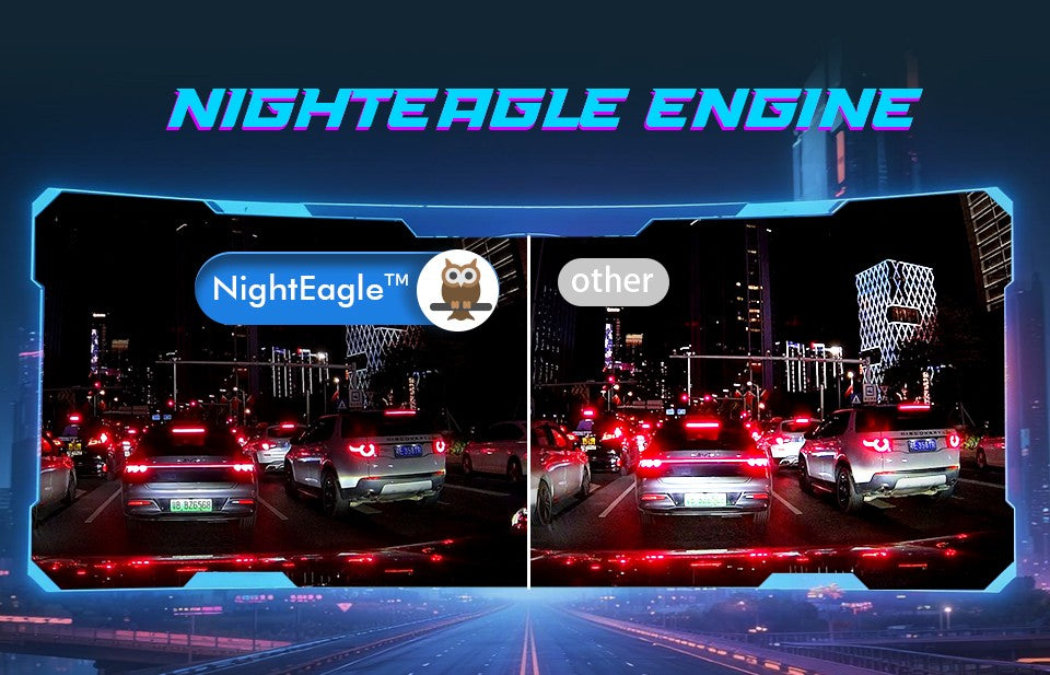 NightEagle™ Engine: a night vision processing technology developed by KAWA, enhances critical details like license plates in low-light conditions, help to capture clearer footage at night—drive with greater peace of mind. Clearer nights, safer drives. The dash cam’s enhanced night vision captures sharper license plates and balanced light even in the dark.
