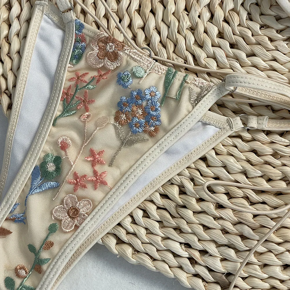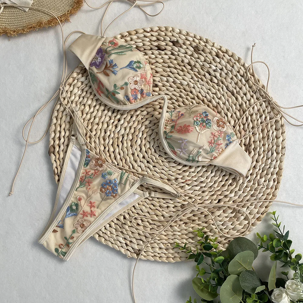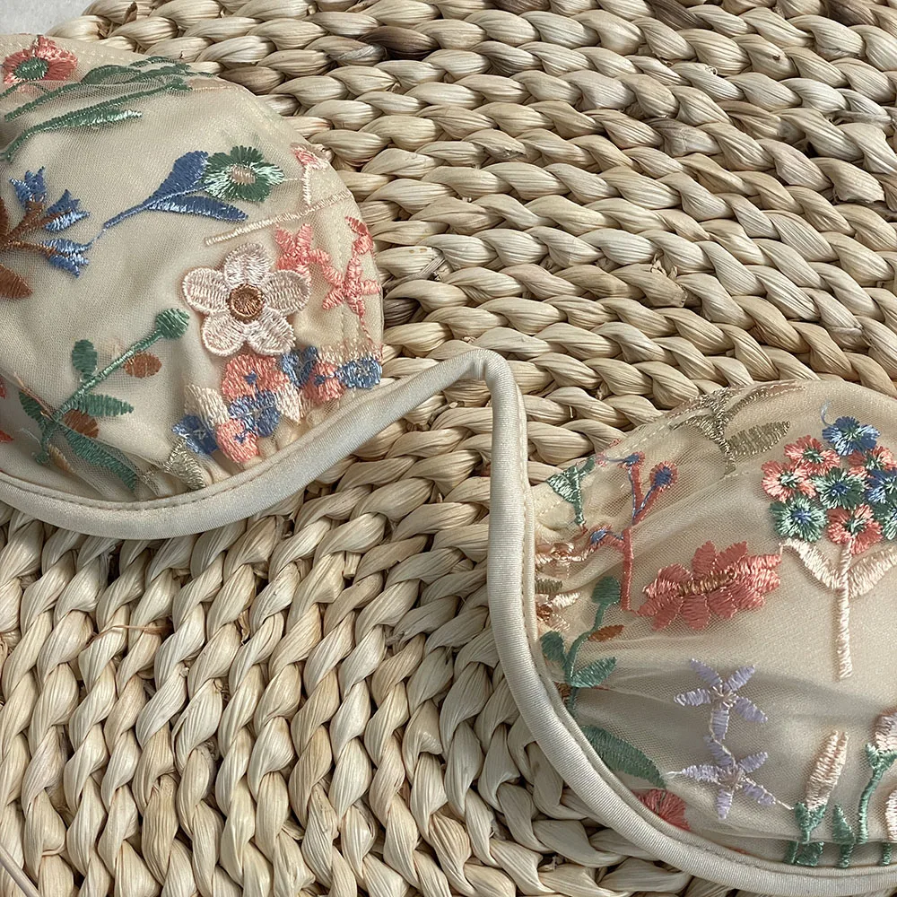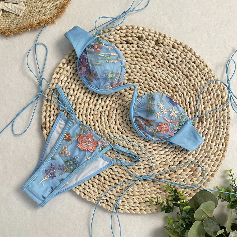 DEBAIOR 2025 Women Bikini Set Floral Embroidery Lingerie Set Women Sheer 2-Piece Boho Bra + Panty Underwear Set Intimates