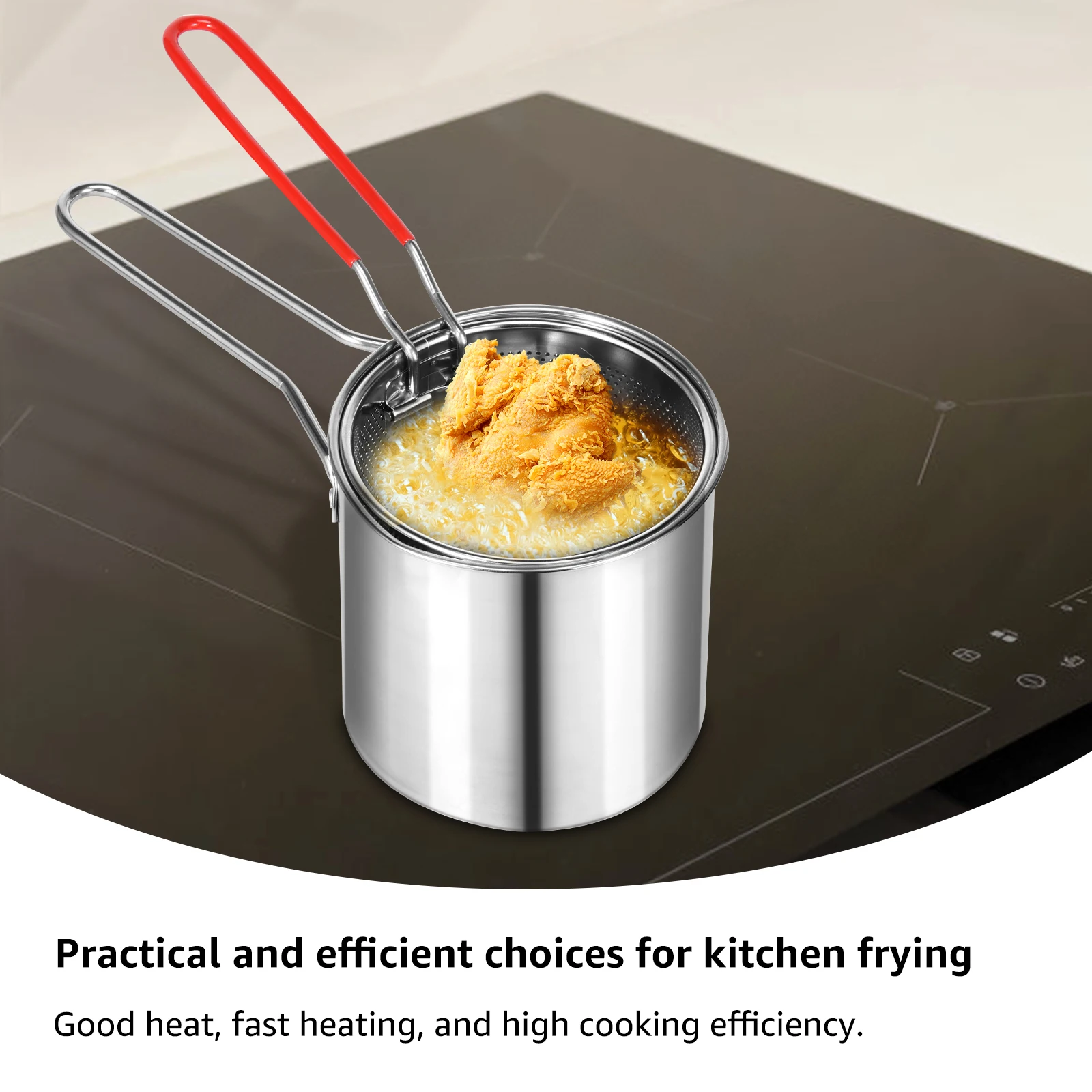 [Extended Handle] This fryer pot is designed with an extended handle, safe and convenient to use, to avoid burns. Rivet connection, not easy to fall off, no coating, the frying basket handle can be detached design, space-saving.