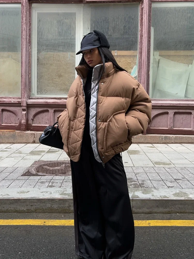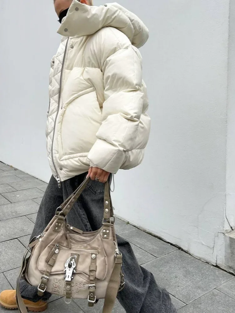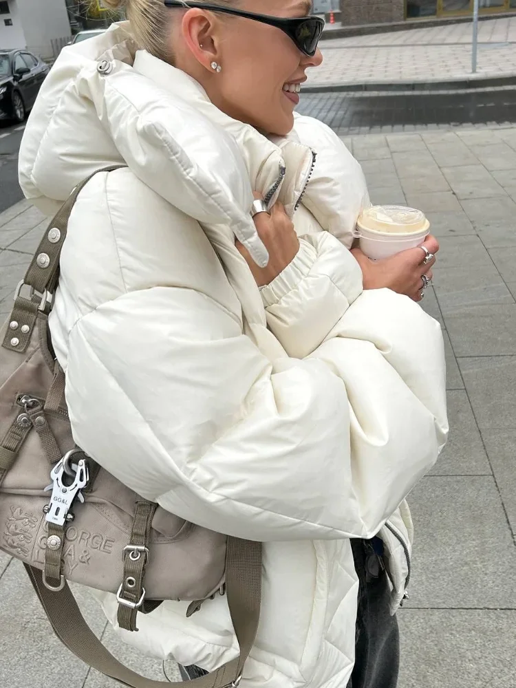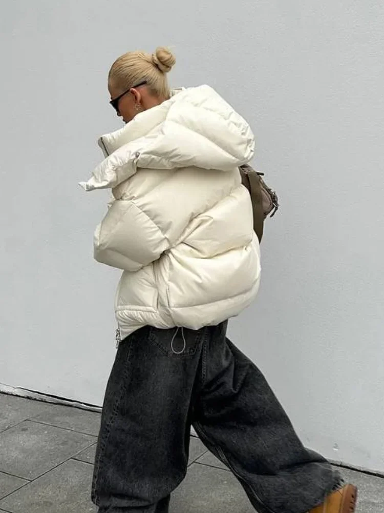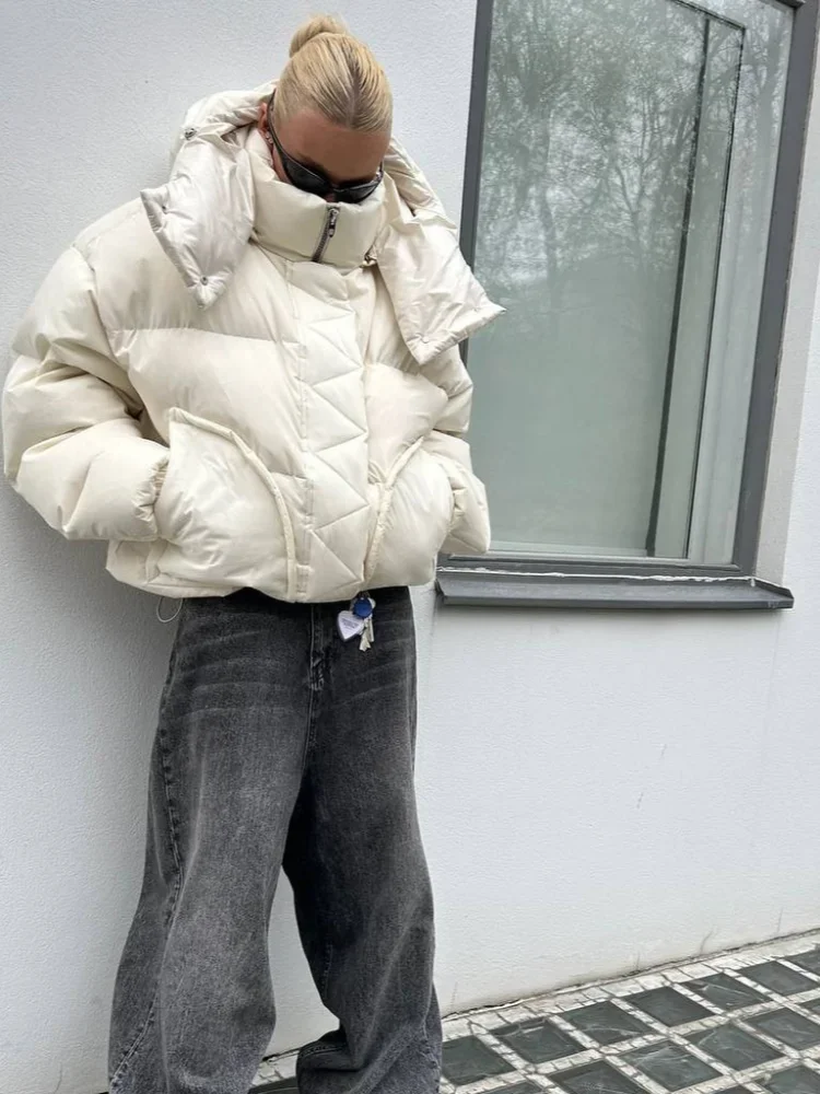 Detachable Hooded Padded Jackets Women's Loose Full Sleeves Zipper Pockets Stand Collar Coats 2025 Autumn Winter Female Outwear