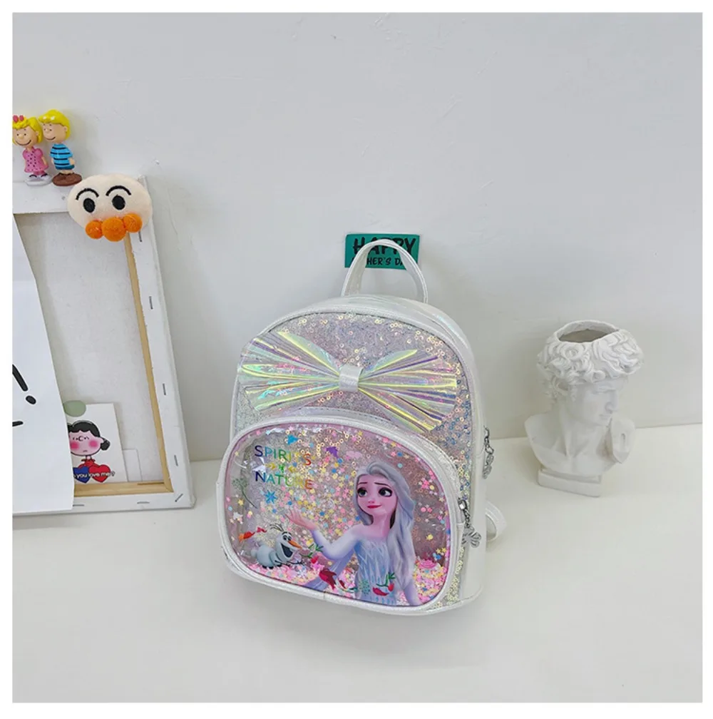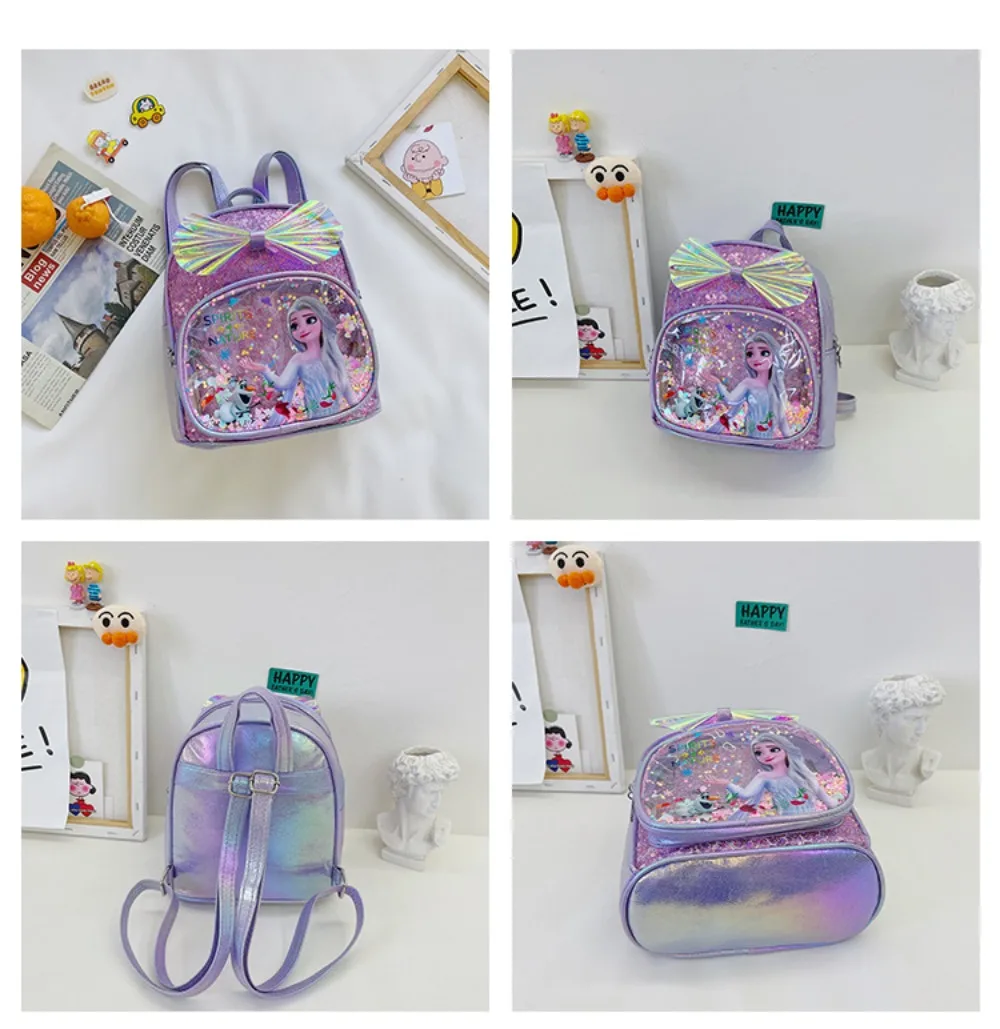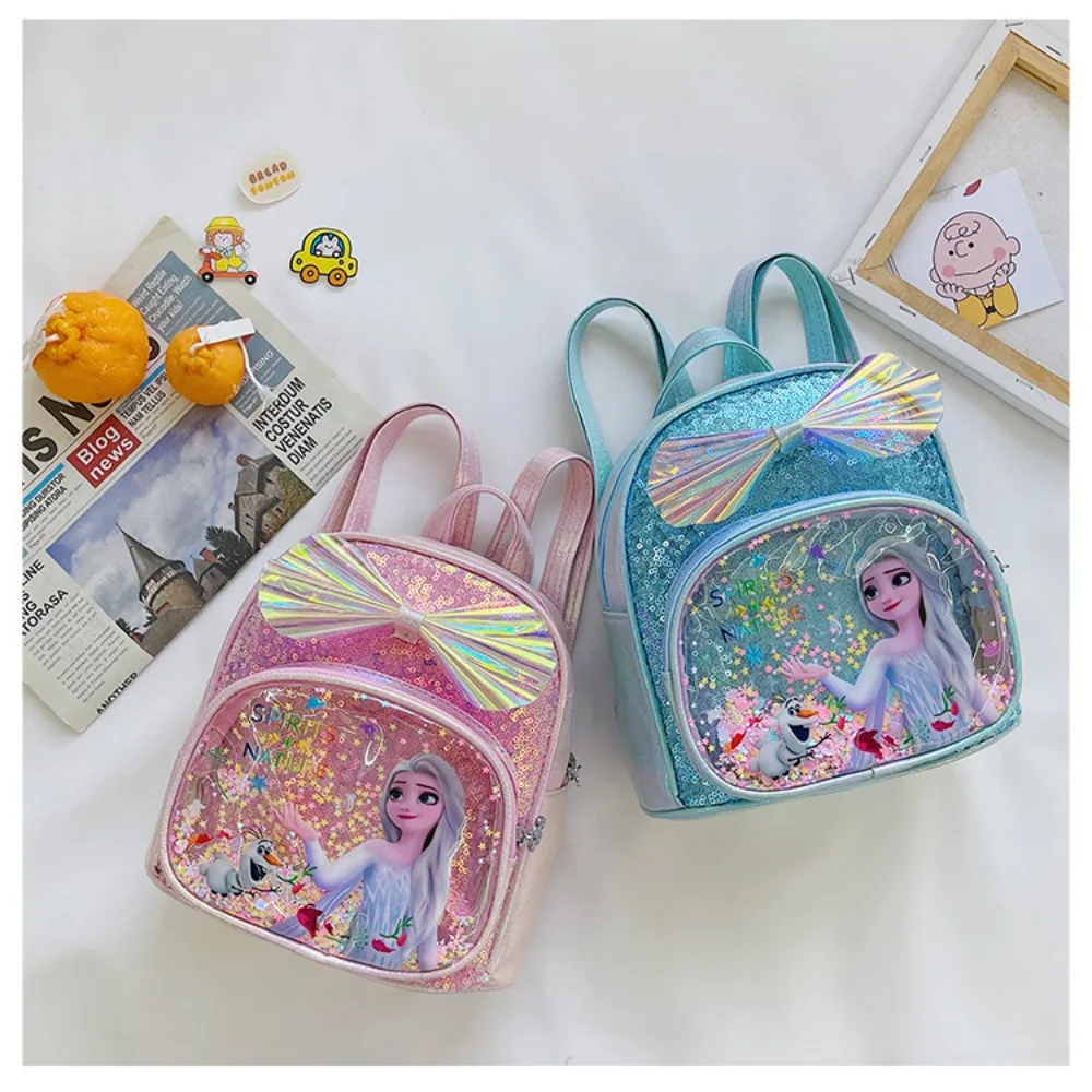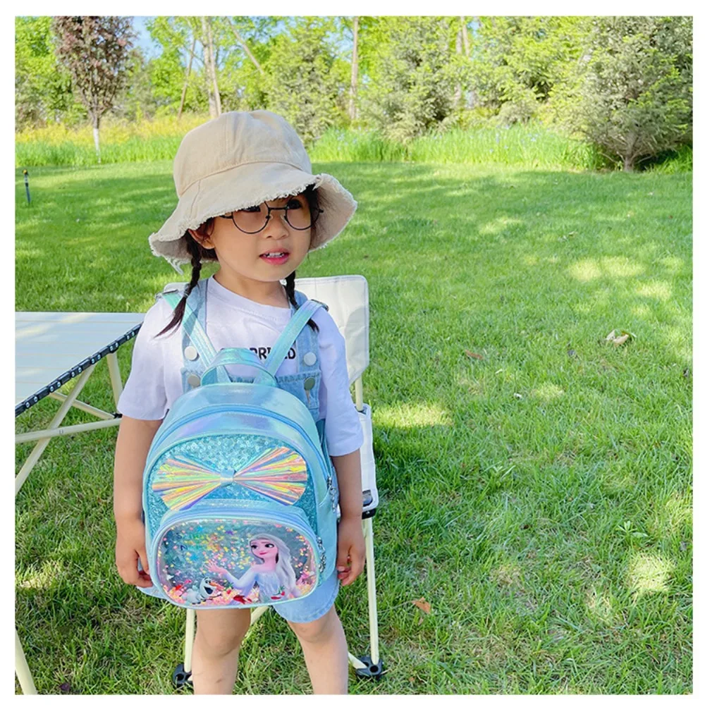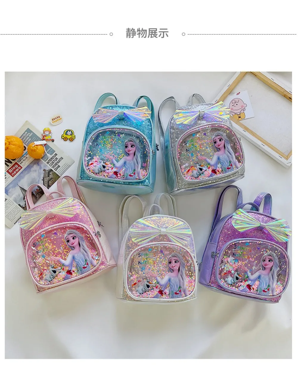 Disney Frozen Elsa Princess Glitter Mini Backpack Cute Bow Sequin Kindergarten Girls School Bag Kids Cartoon Double Shoulder Bag