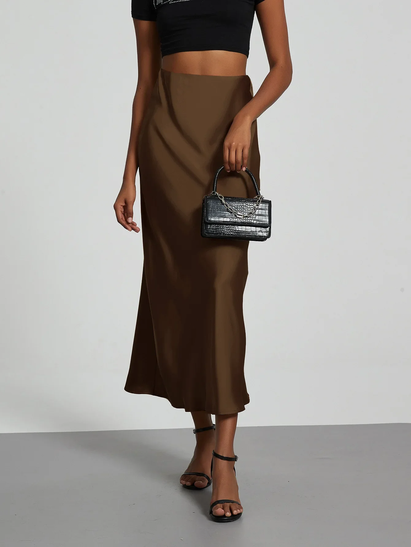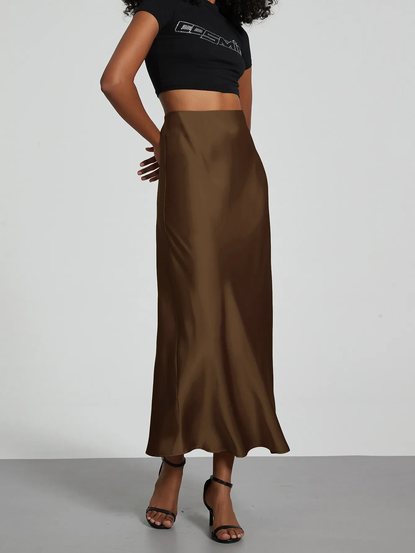 Elegant Fashionable European Style Women's Midi Skirt With Satin Texture Versatile Solid Color Bright Light Sensation Long Dress
