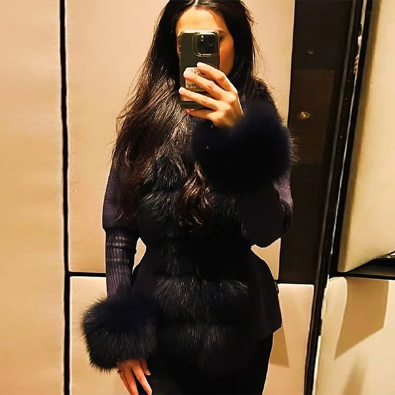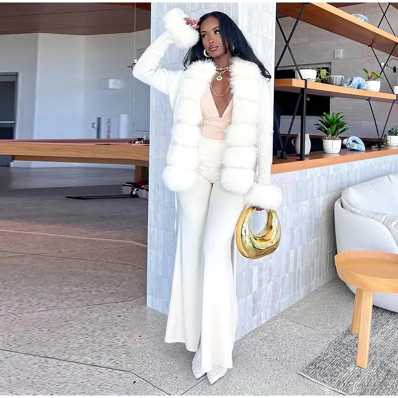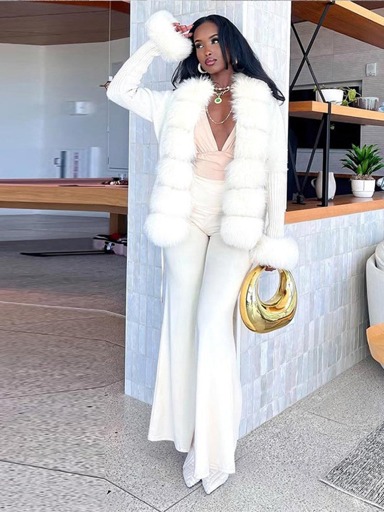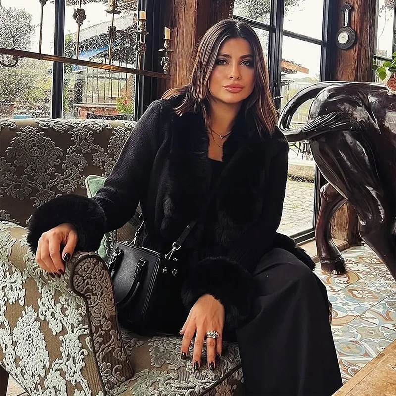 Elegant Knitted Faux Fur Patchwork Women's Coat Thicken Lady Coats 2025 Autumn Winter Chic Female Street Warm Outerwears