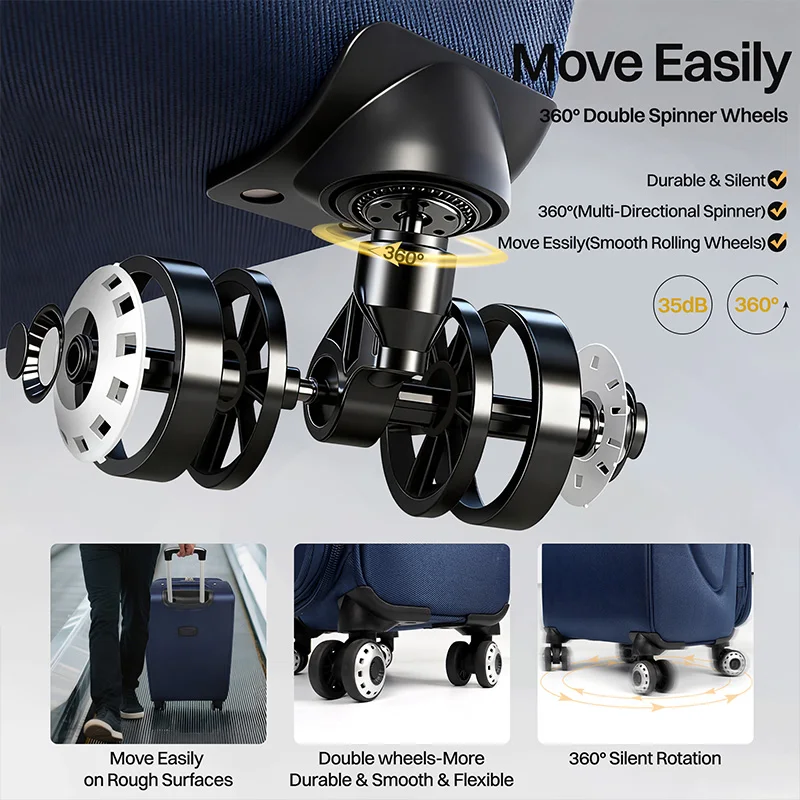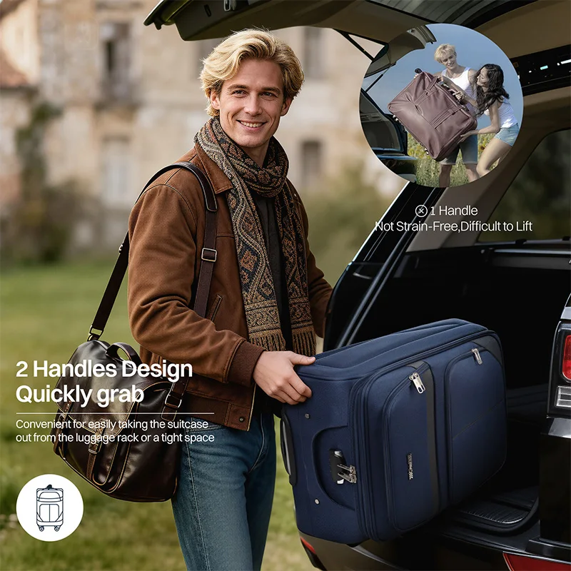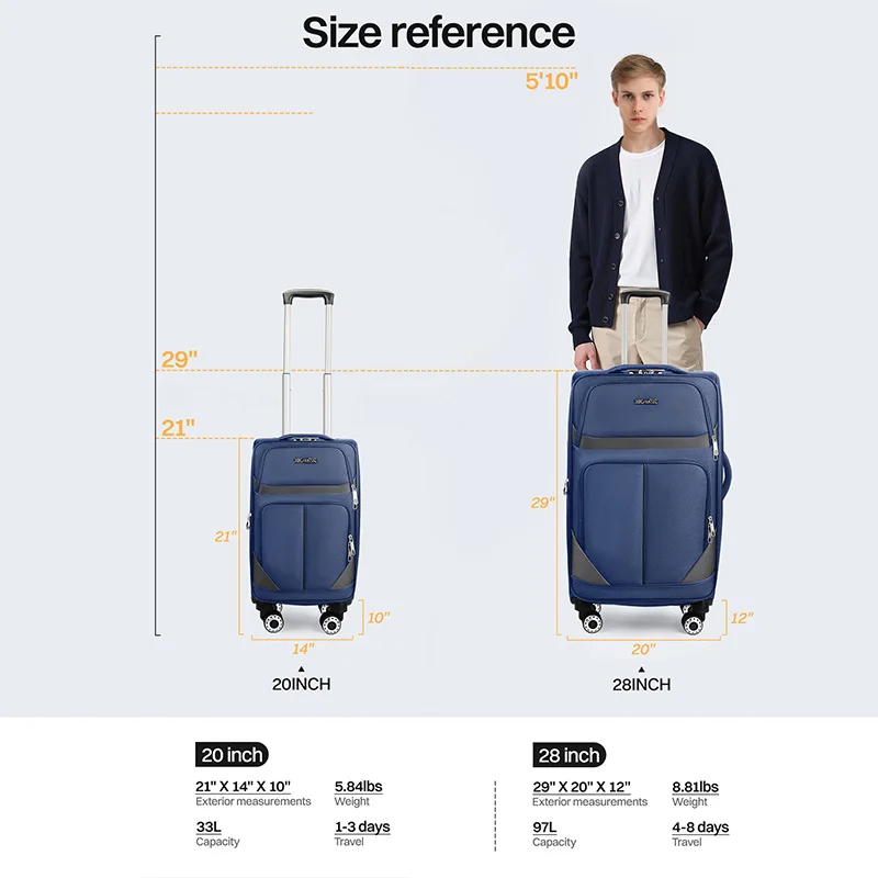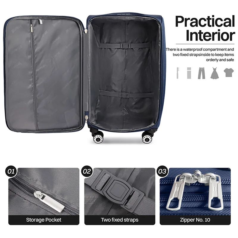 The softside suitcase body is made of high-quality fabric material, which has excellent flexibility and wear resistance, and can easily withstand all kinds of wear and tear during the journey.The spacious interior is large enough to hold everything you need during your trip. With an expandable function, it can increase the storage capacity by 20%, so you don't have to worry about having too much luggage anymore.The front of the luggage is designed with multiple zippered pockets, providing you with additional storage space. It is equipped with a retractable telescopic handle, and the universal wheels can rotate freely at 360 degrees, enabling the luggage to move flexibly.And at the corners and handles of the luggage, leather materials are selected for the design, adding a touch of luxury to the luggage and also improving its durability.