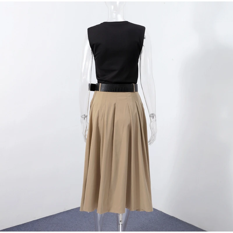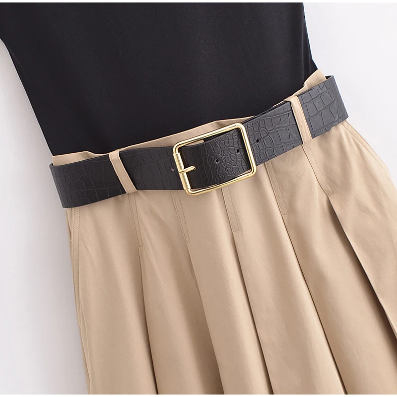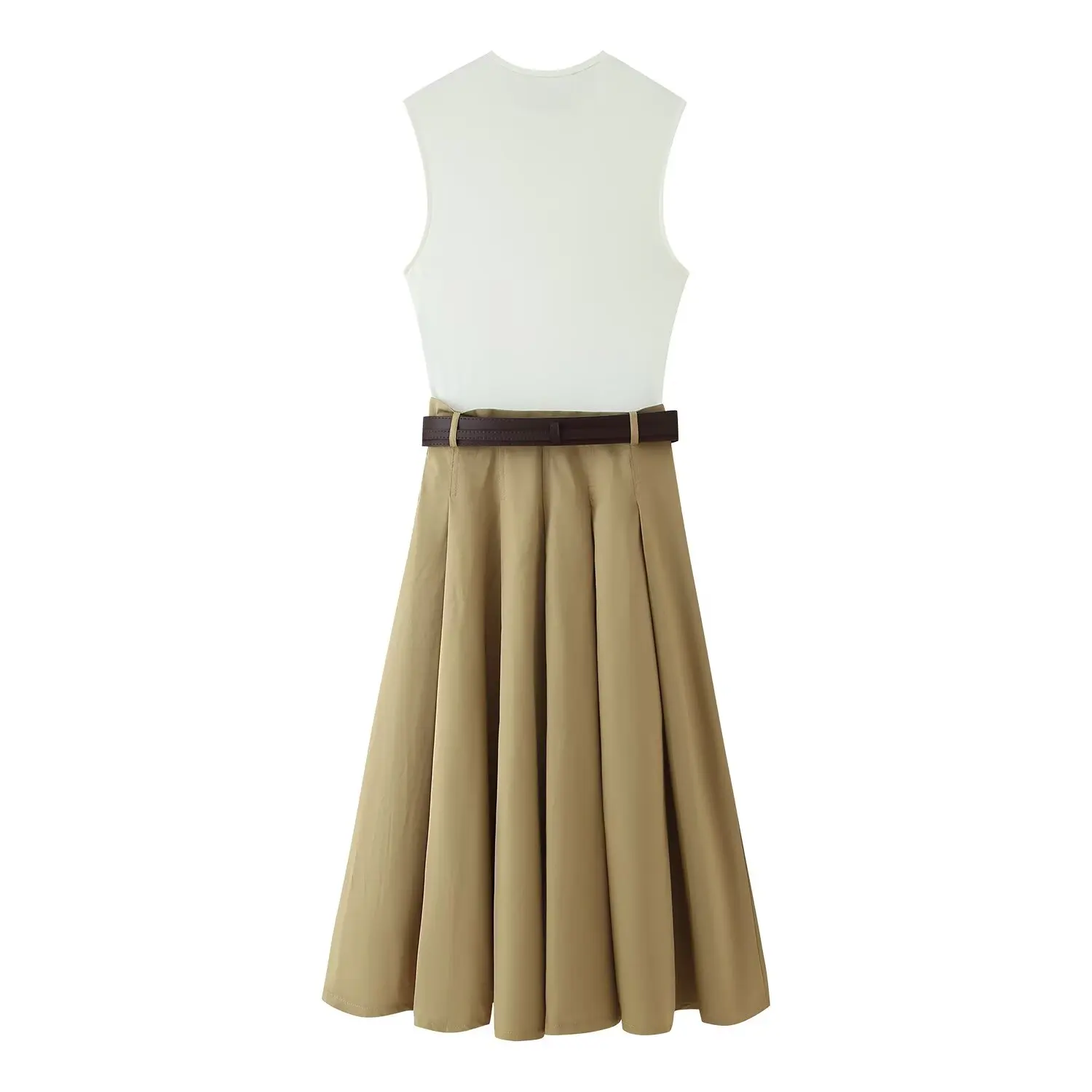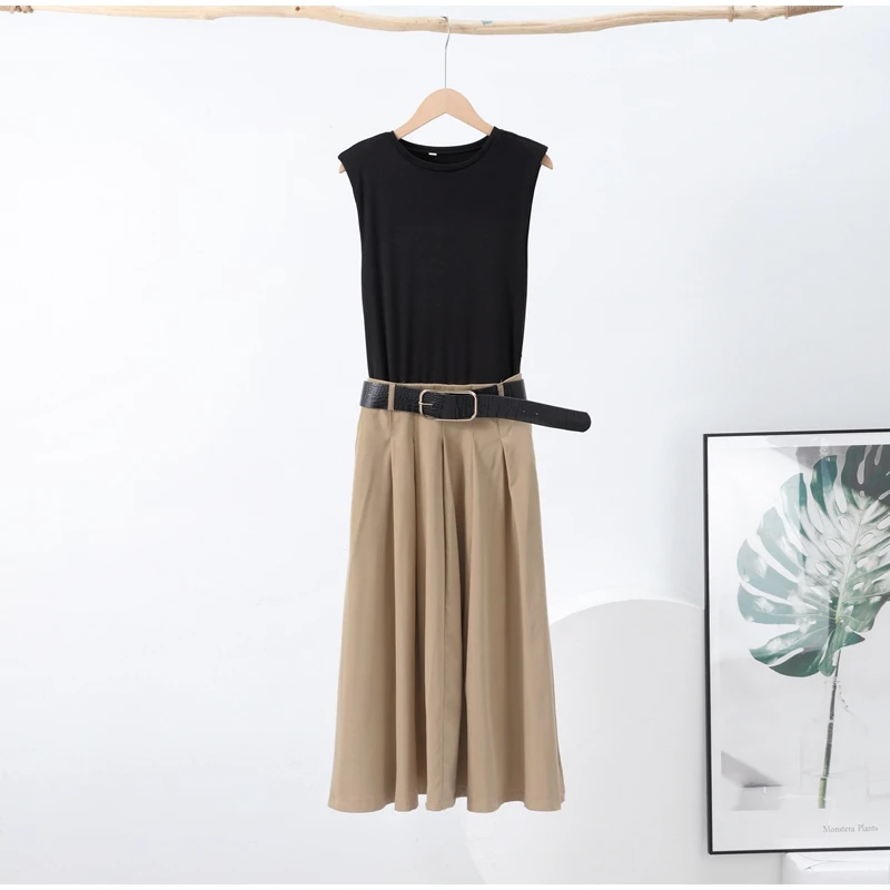 Fashion Patchwork Pleated Long Dress With Belt Women Chic Sleeveless Tank Maxi M