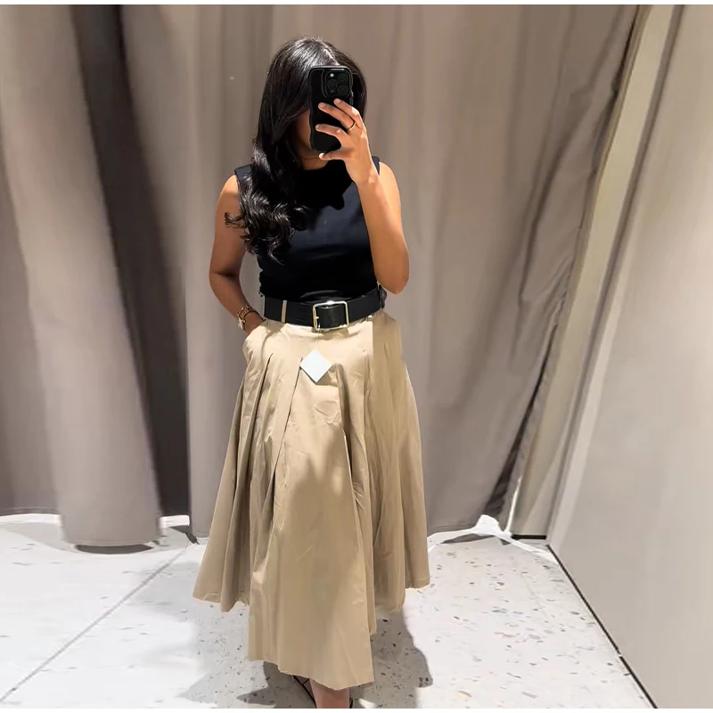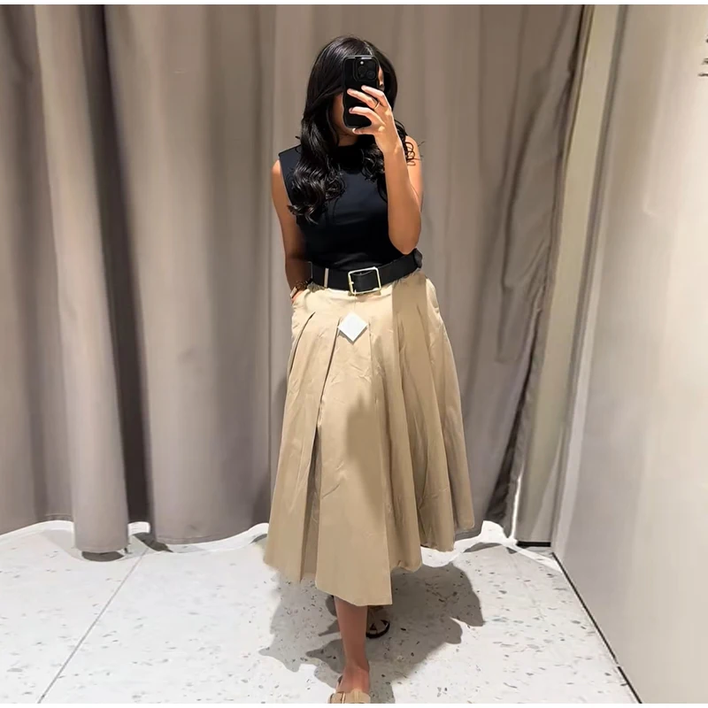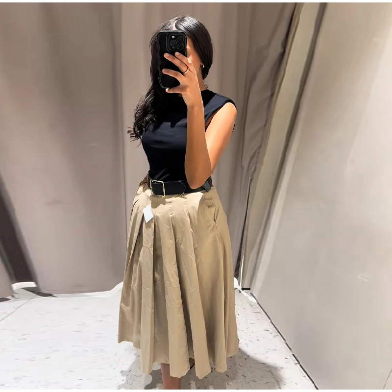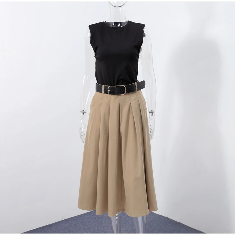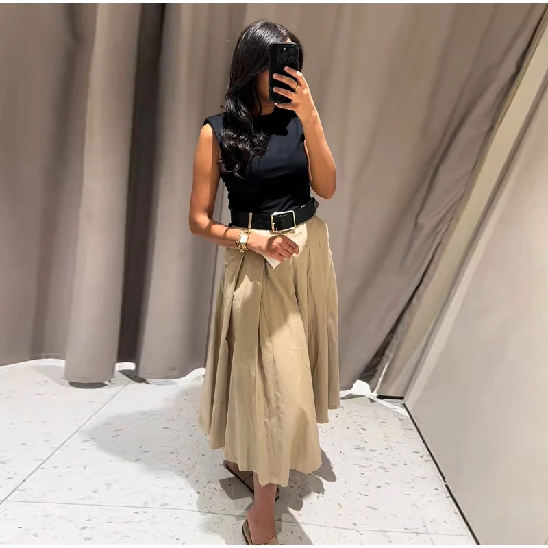 Fashion Patchwork Pleated Long Dress With Belt Women Chic Sleeveless Tank Maxi M