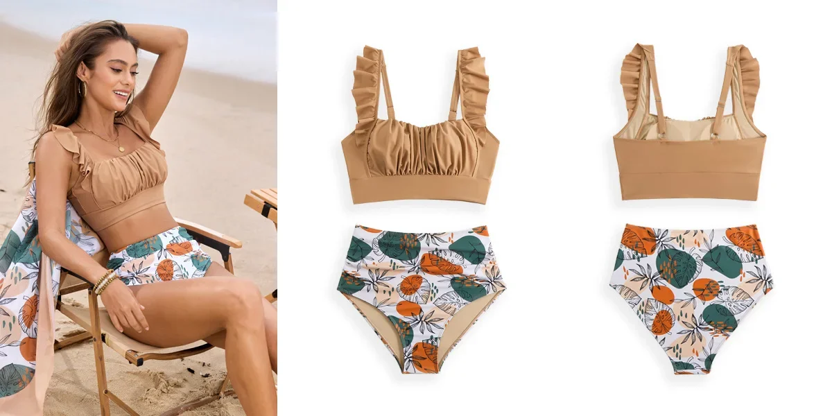 Fashion Printing Swimsuit Two Piece For Women Ruffle Swimwear Tops And High Waist Bikini Swim Shorts For Women For Teen Girls