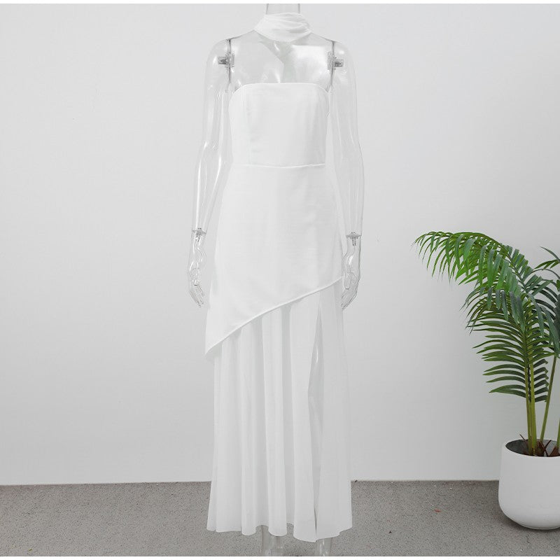 Fashion Strapless Ribbon Mesh Patchwork Maxi Dress Elegant Sleeveless Backless V