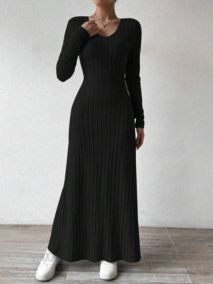 Fashionable Knitted Long Sleeve A- Line Streetwear Dress For Women Smooths And Slims Your Silhouette Solid Color Long Dress