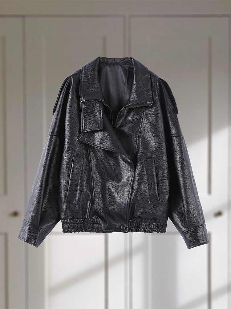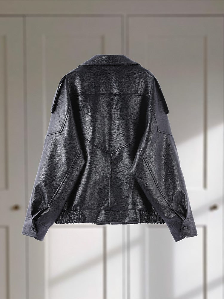 Faux Leather Stand Collar Bomber Jacket Women Locomotive Epaulet Slant Opening Ruched Coats Fashion Autumn Winter Lady Outerwear