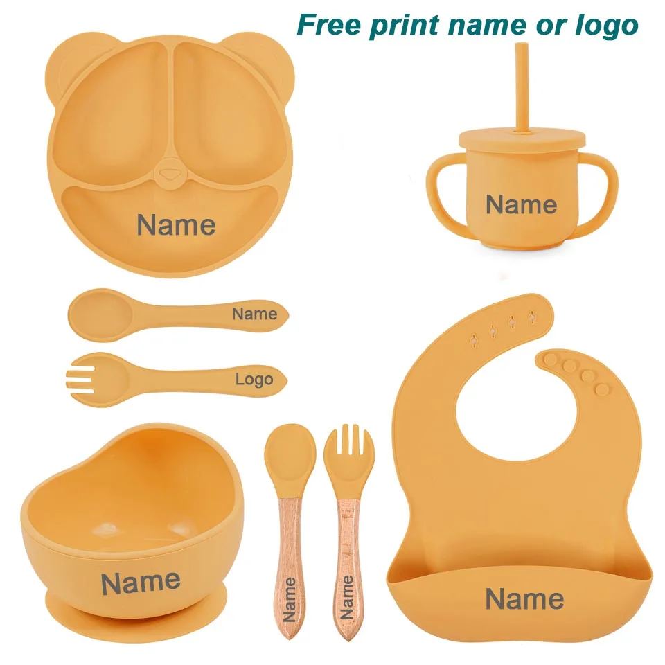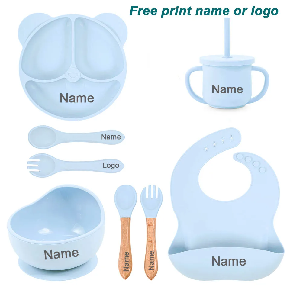 Feeding Set Silicone For Baby Sucker Bowl Dishes Plate For Kids Bear Plate Set Baby Tableware Children's Cup With Straw Personalized Name 8Pcs Dinnerware BPA Free Free Shipping