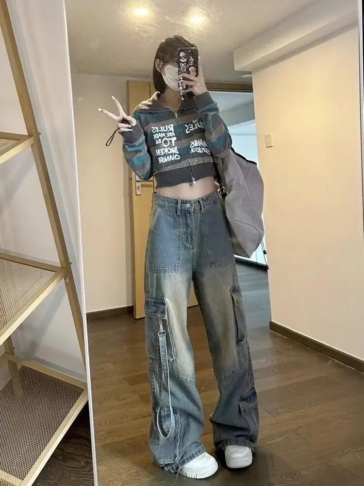 Female Jean Spliced Pockets Cargo Pants Washed Denim High Waist Full Length Jeans Loose Solid Basics Patchwork Distressed