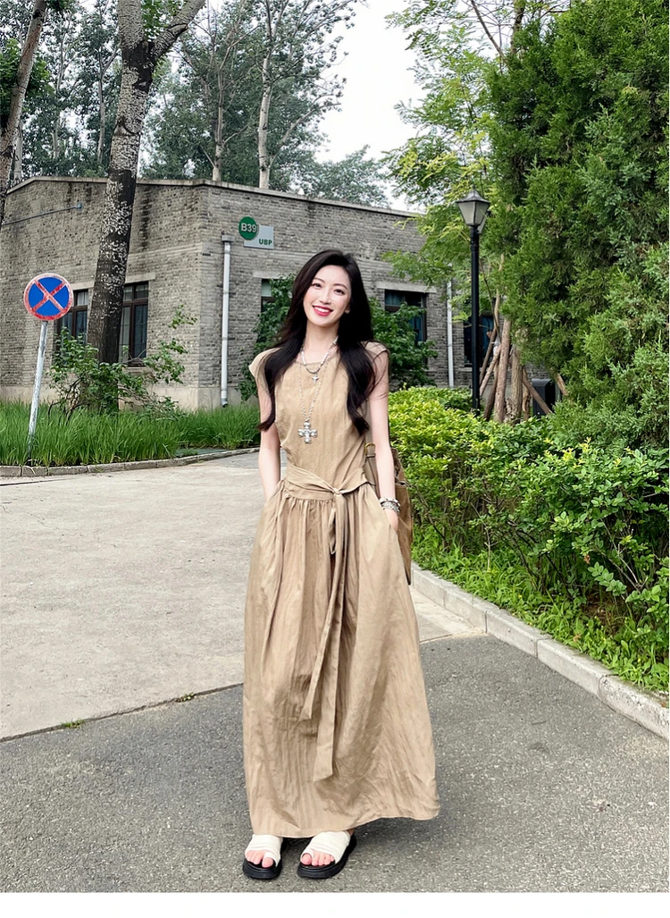 French Riviera Maxi Dress Women Sleeveless Vacation Wear Sculpted Waist Effortless Elegance Seaside Aesthetic Minimalist Luxury