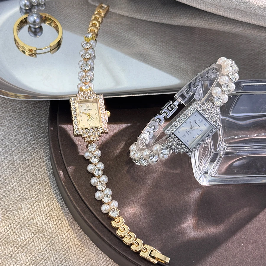 Featuring a square diamond-encrusted dial and double-row exquisite small pearl bracelet, this watch exudes luxury and elegance.