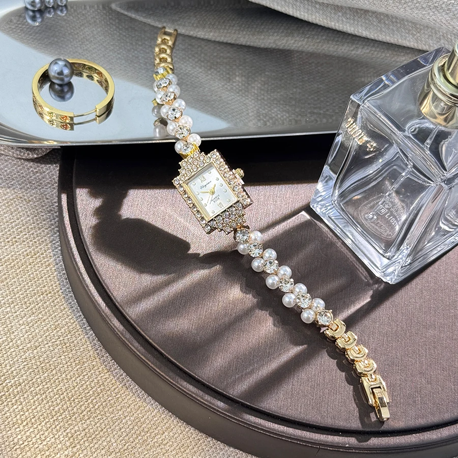French Romantic Double-Row Exquisite Small Pearl Bracelet Watch Square Diamond-Encrusted Light Luxury Ladies Quartz Watch