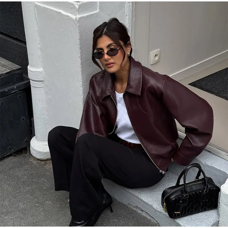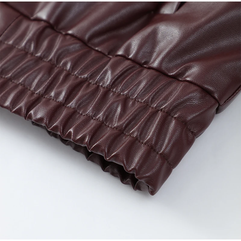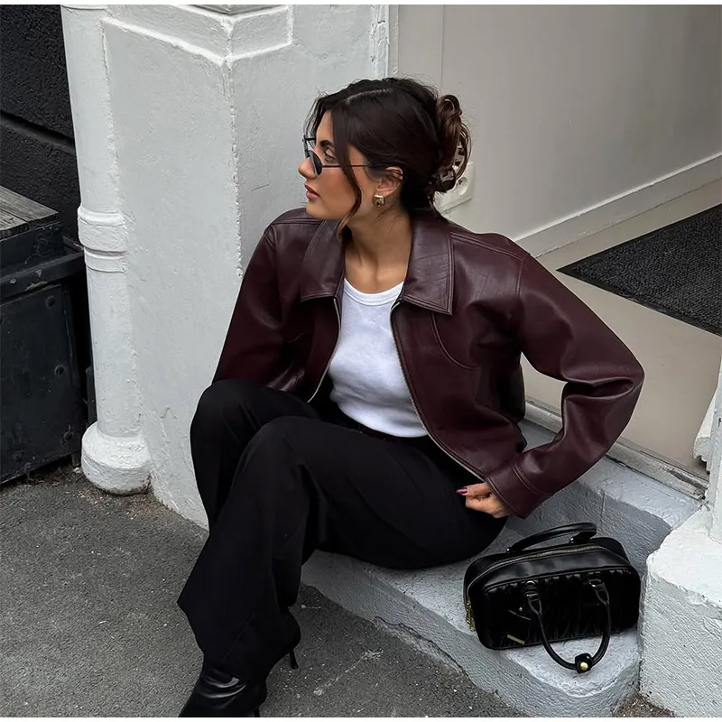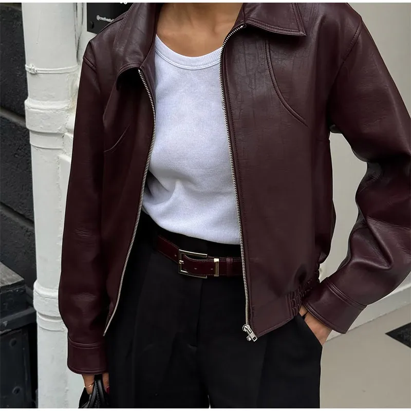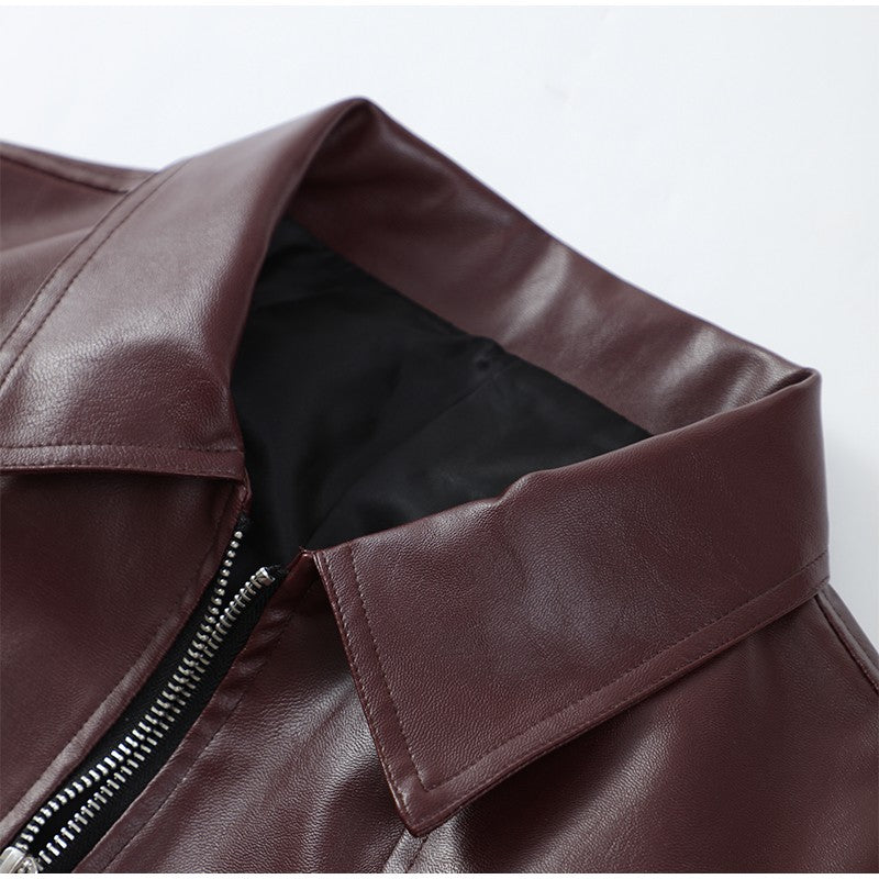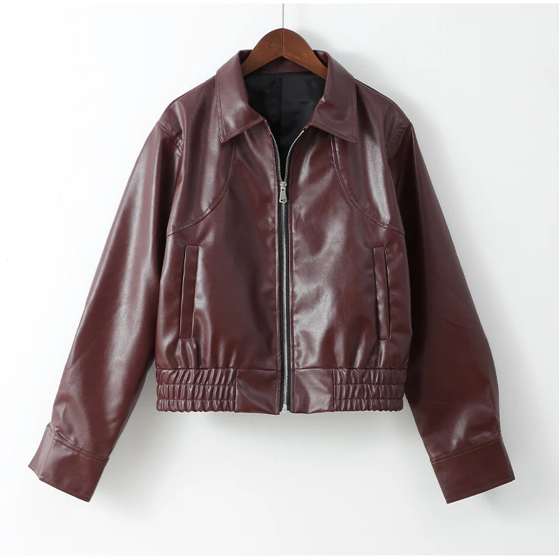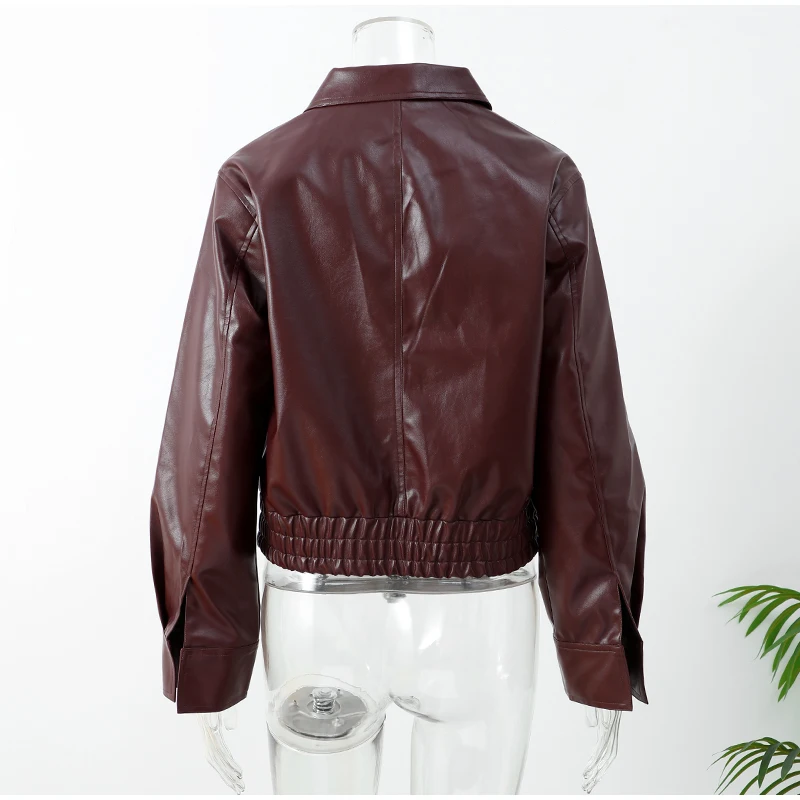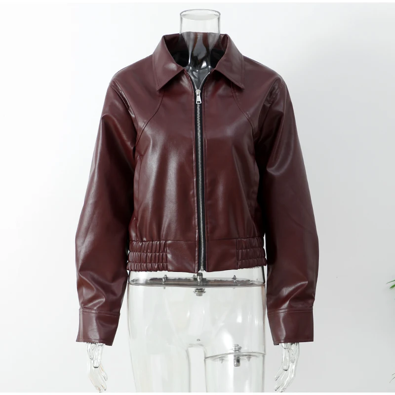 Full Sleeve Cropped Women Casual Slim Thin Motorcycle Coat Chic Zipper Lapel Wine Red Leather Jacket Lady New Highstreet Outwear