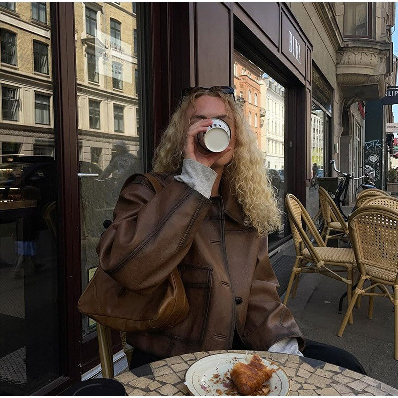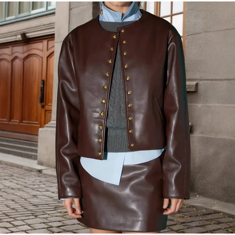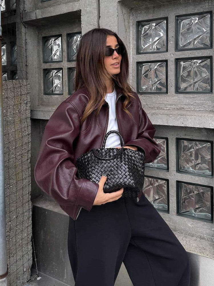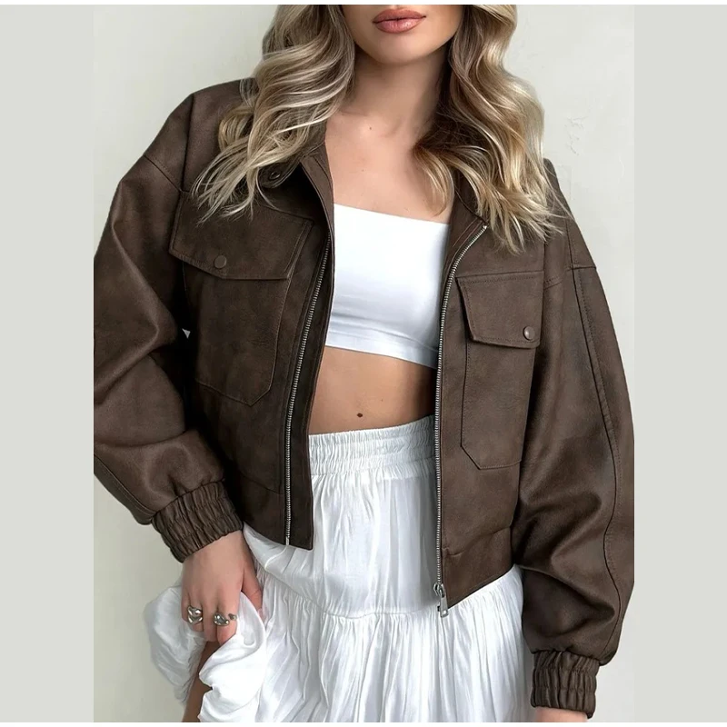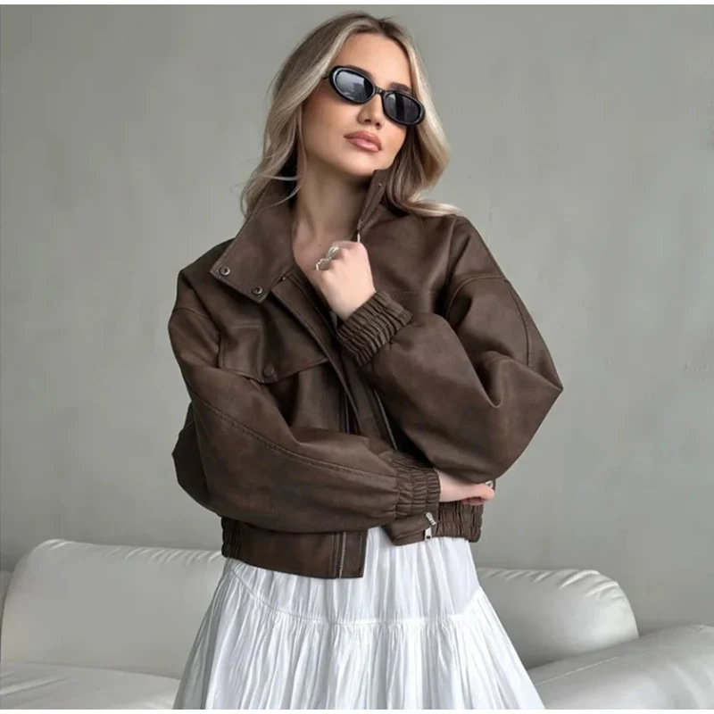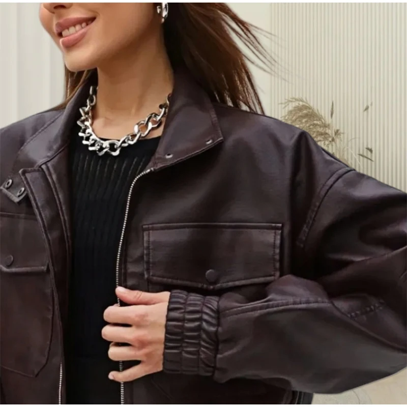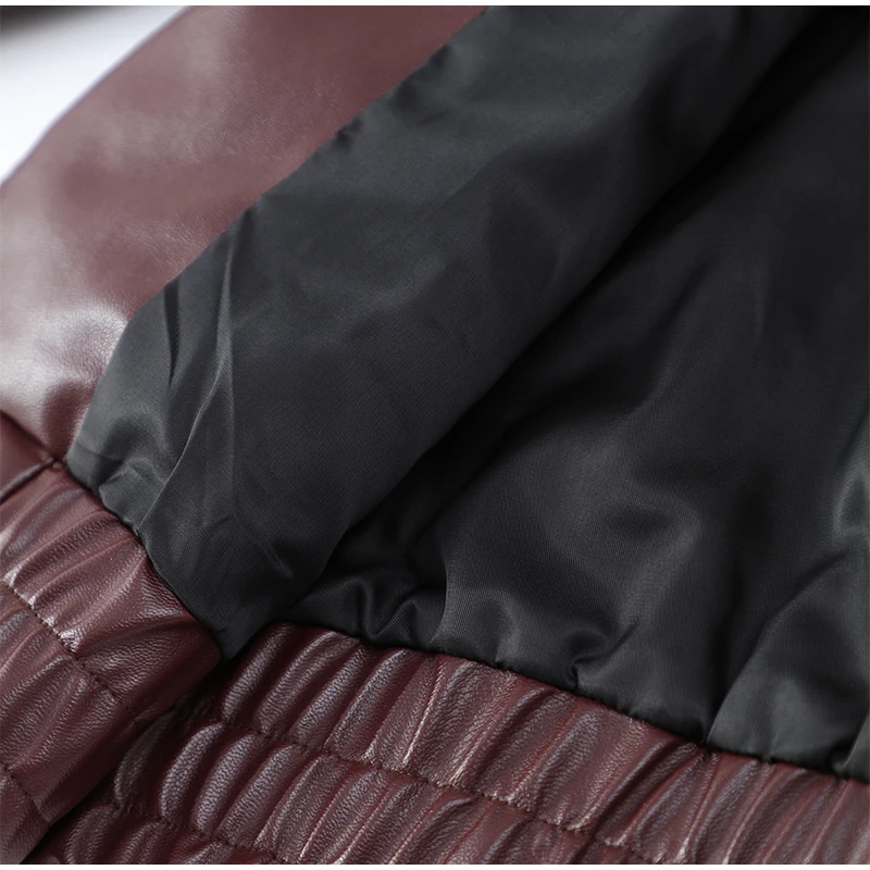 Full Sleeve Cropped Women Casual Slim Thin Motorcycle Coat Chic Zipper Lapel Wine Red Leather Jacket Lady New Highstreet Outwear