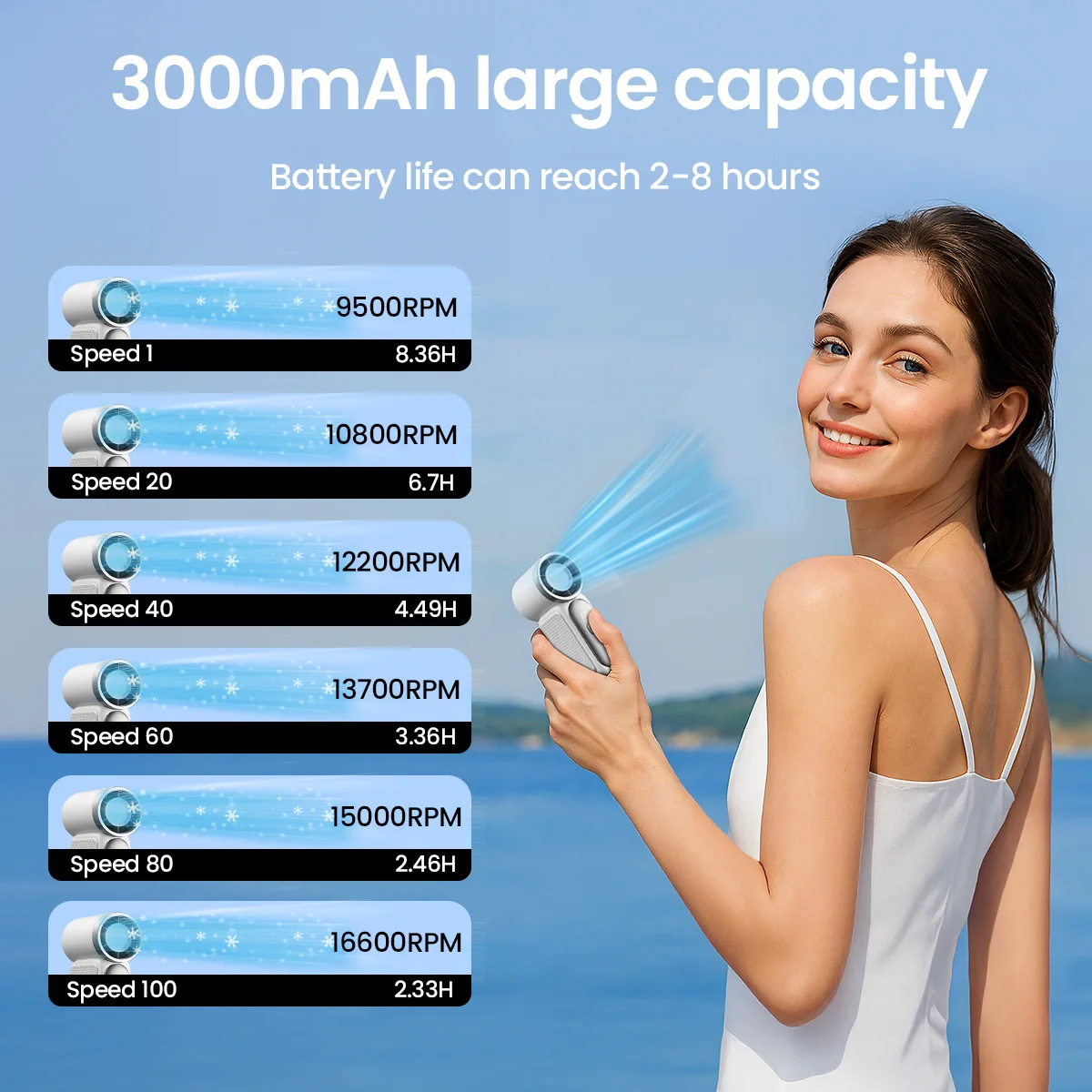 2. Strong wind power: Driven by a high-speed motor, it provides multiple wind speed adjustments (up to 7.9m/s at the highest level) to meet the needs of different scenarios.