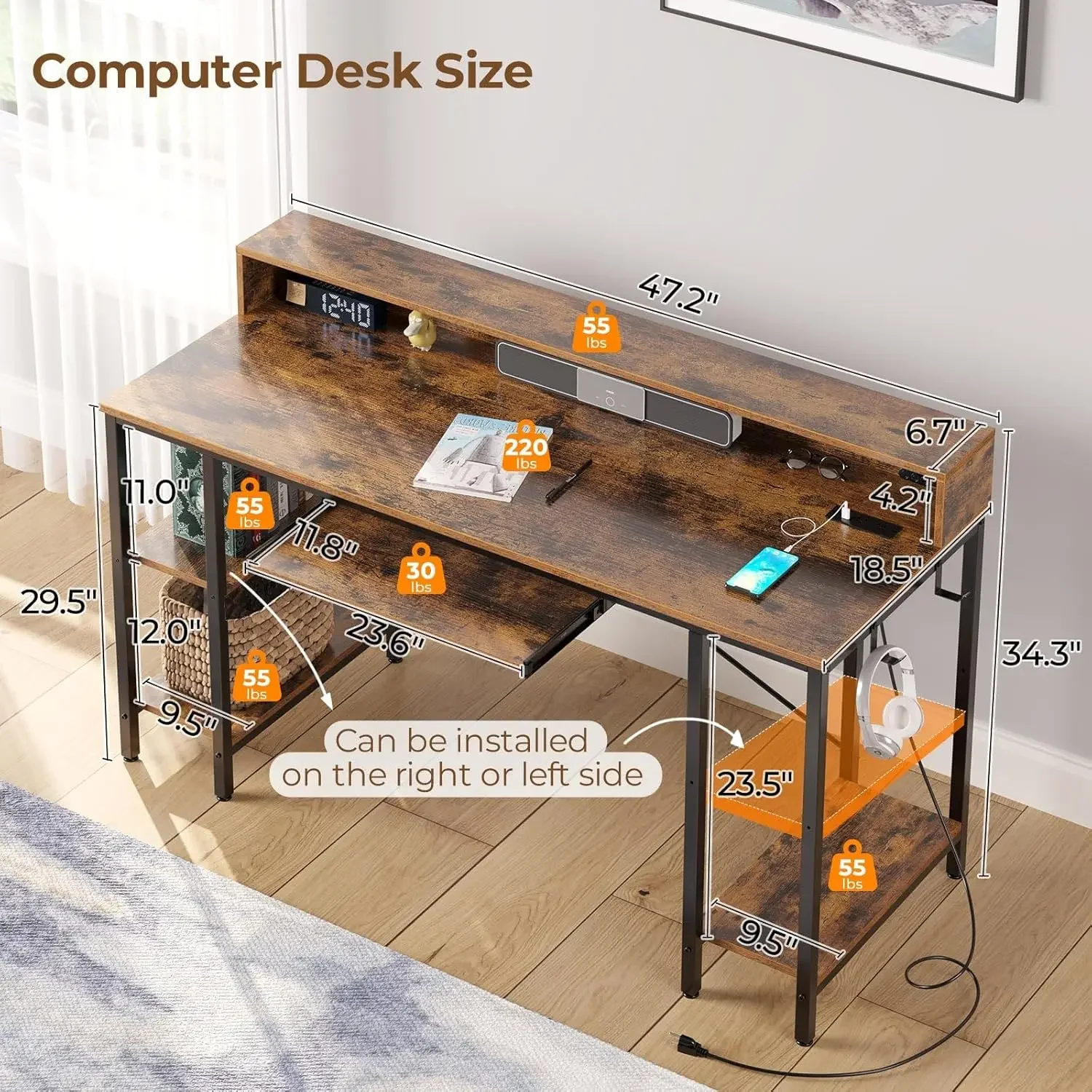 Computer Desk 47 inch with LED Lights & Power Outlets, Gaming Desk with Storage Shelves, Home Office Desk with Keyboard Tray, Writing Desk with Monitor Stand, Work Desk, Rustic Brown
