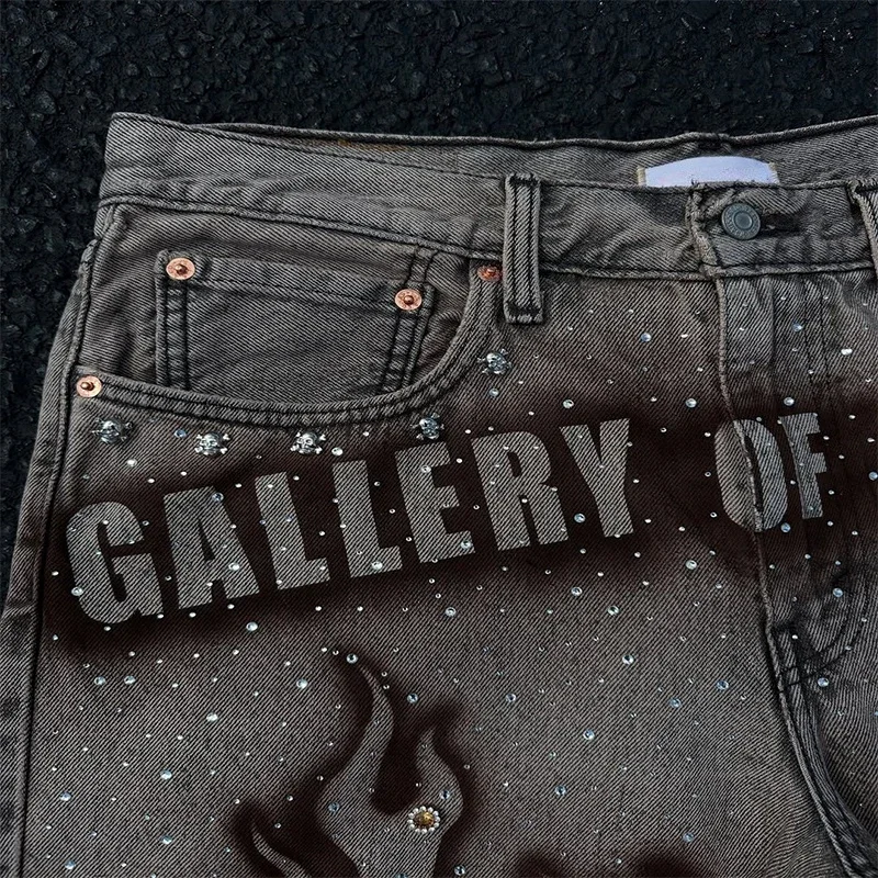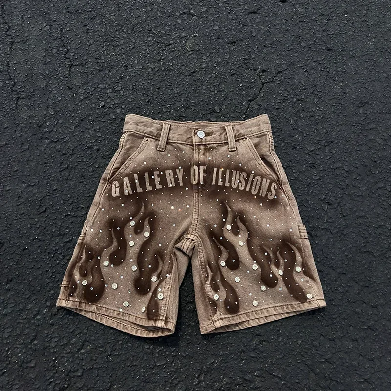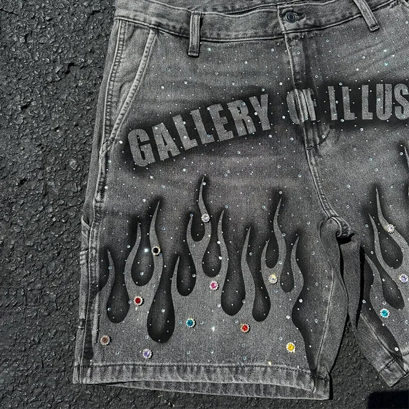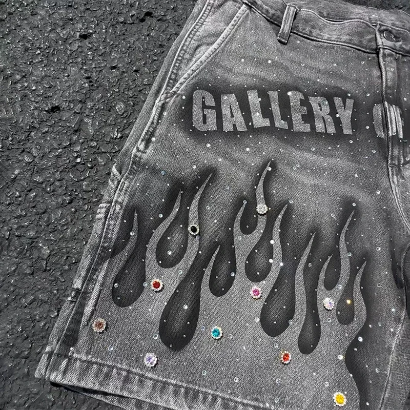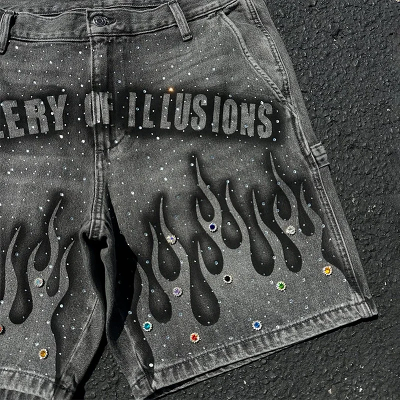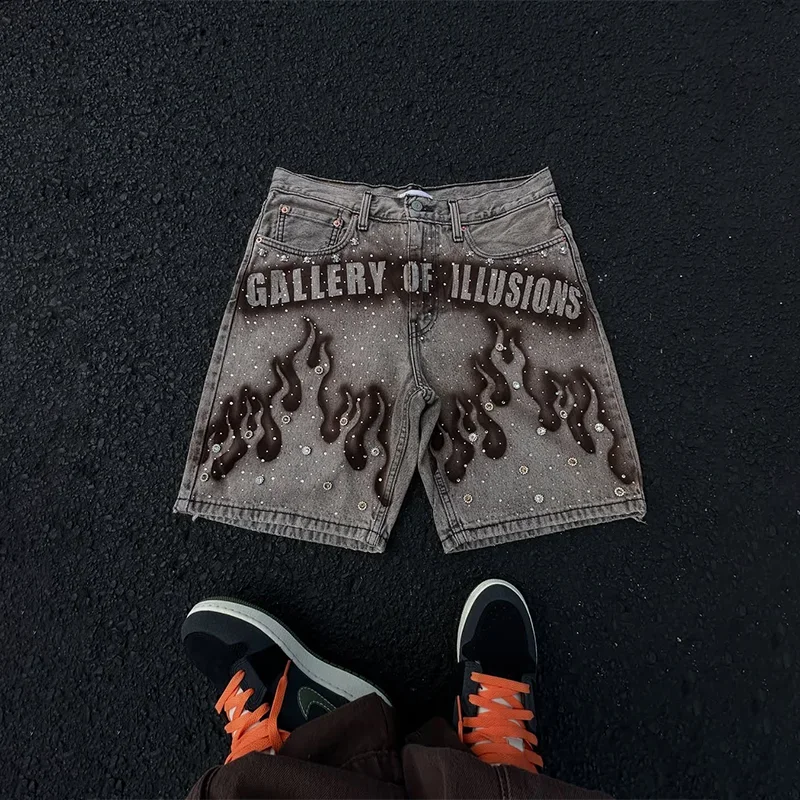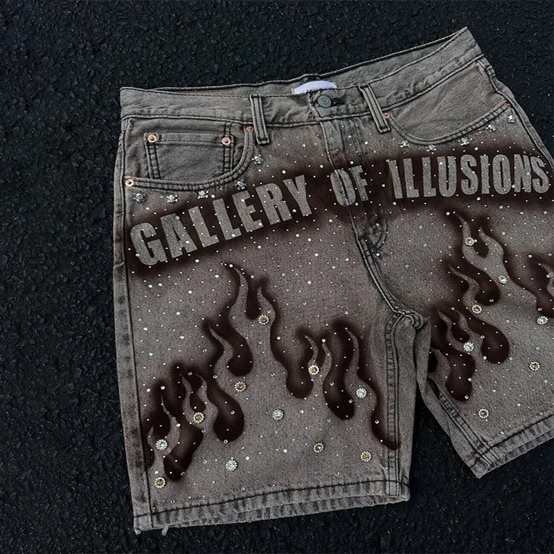 Goth Print Silk Jeans Men Shorts Street Harajuku Hiphop Vintage High Waited Denim Shorts of Men Clothing Casual Loose Pants Mens