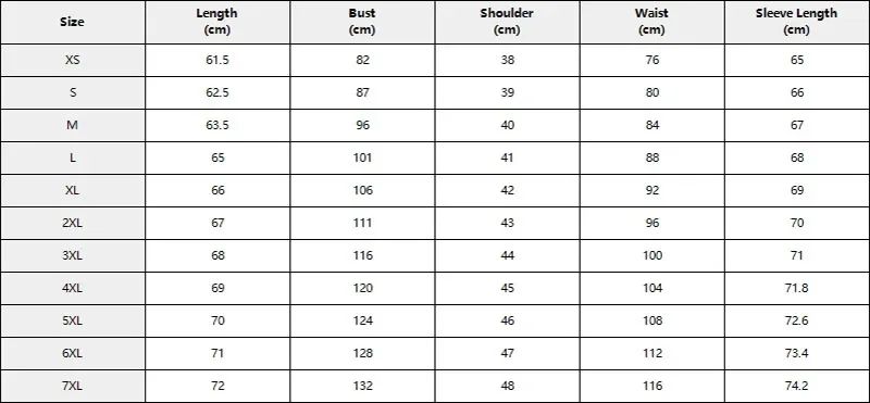 Size: XS, S, M, L, XL, XXL, 3XL, 4XL, 5XL, 6XL, 7XL