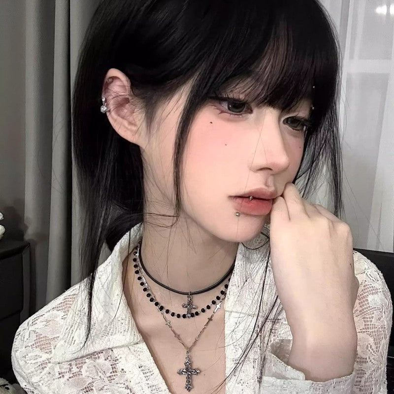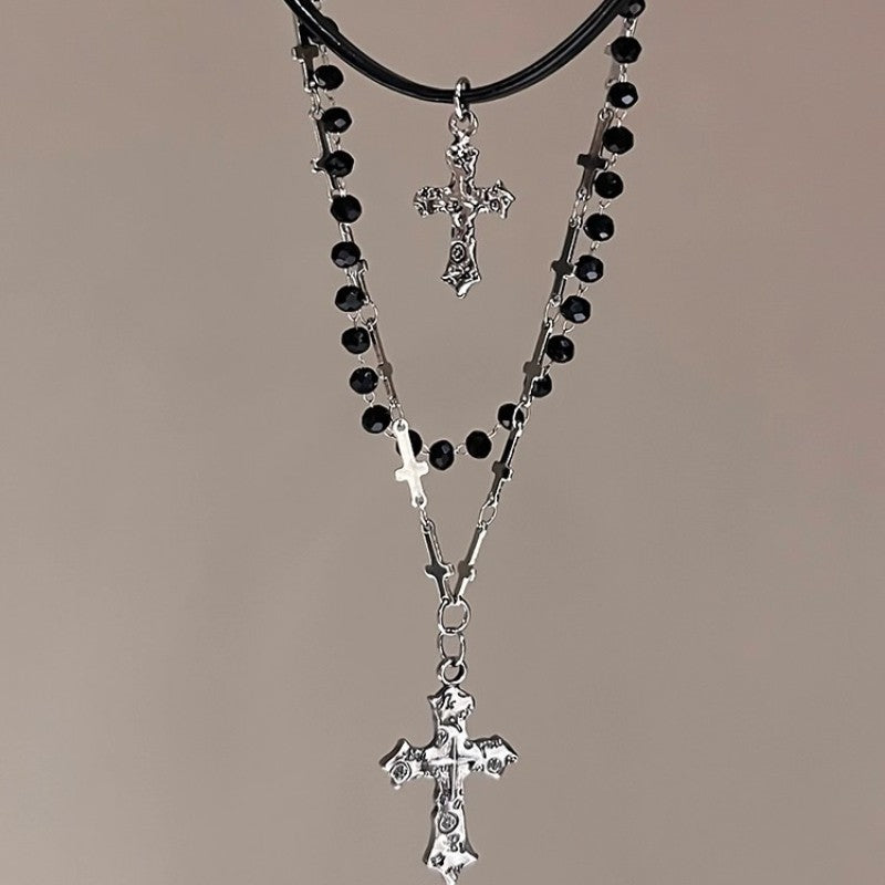 Gothic Punk Y2K Black Cross Pendant Necklace for Women Men 2025 Vintage Multi Layer Bead Necklaces 90s EMO Charm Jewelry Gifts