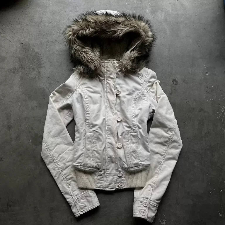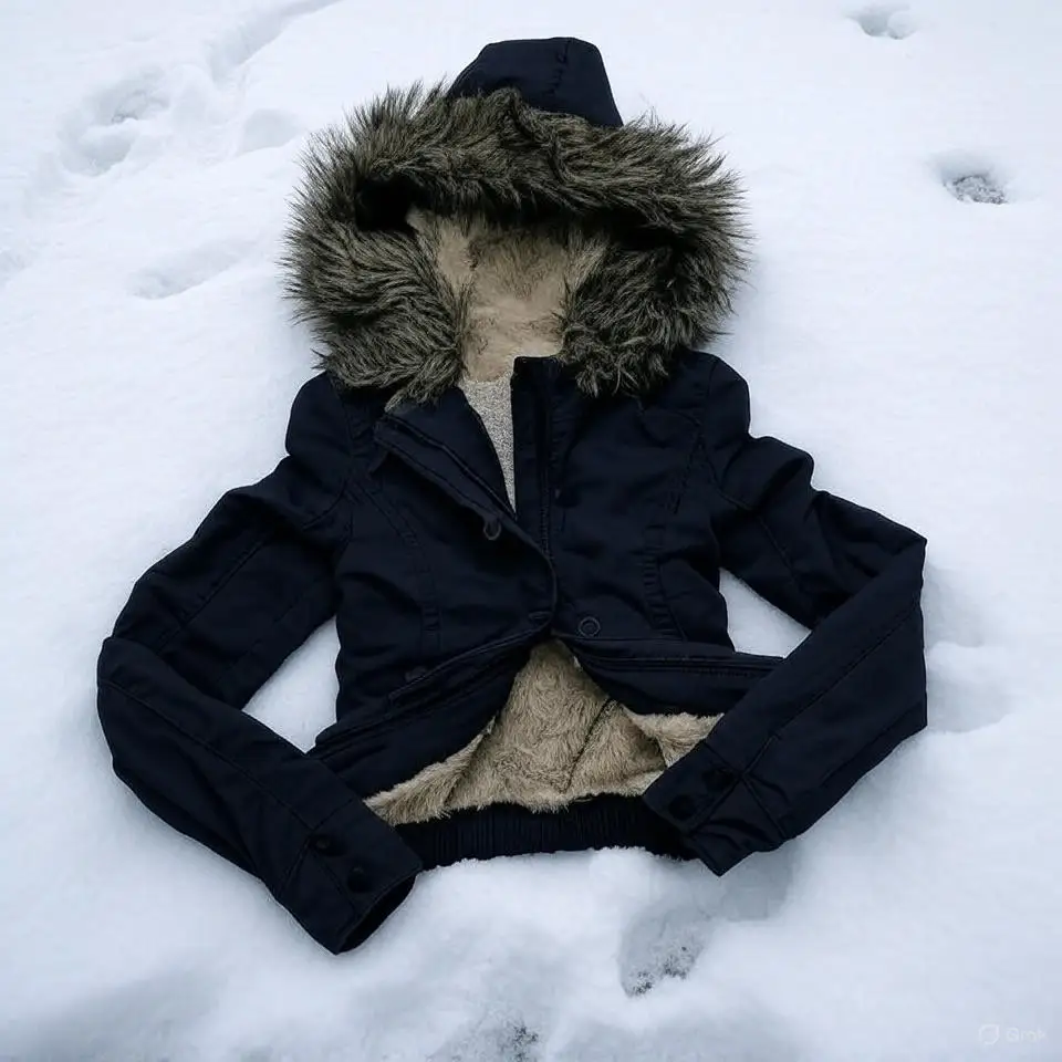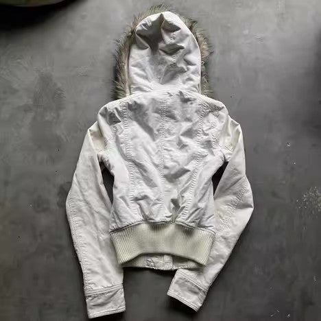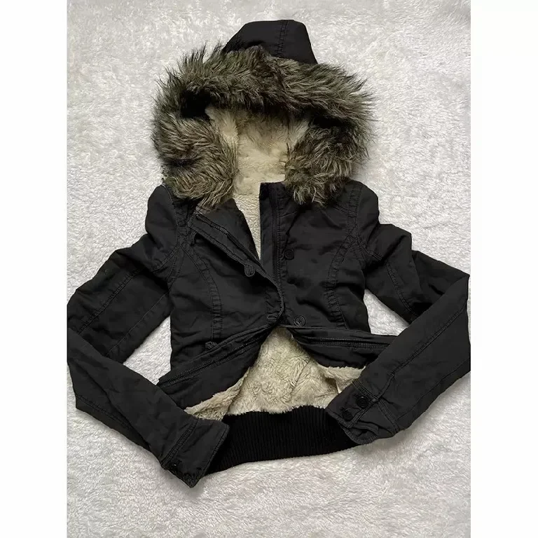 Gothic Y2K Womens Vintage Fur Trimmed Hooded Jacket Autumn Winter Black Shearling Lined Zipper Coat Warm Casual Winter Outerwear