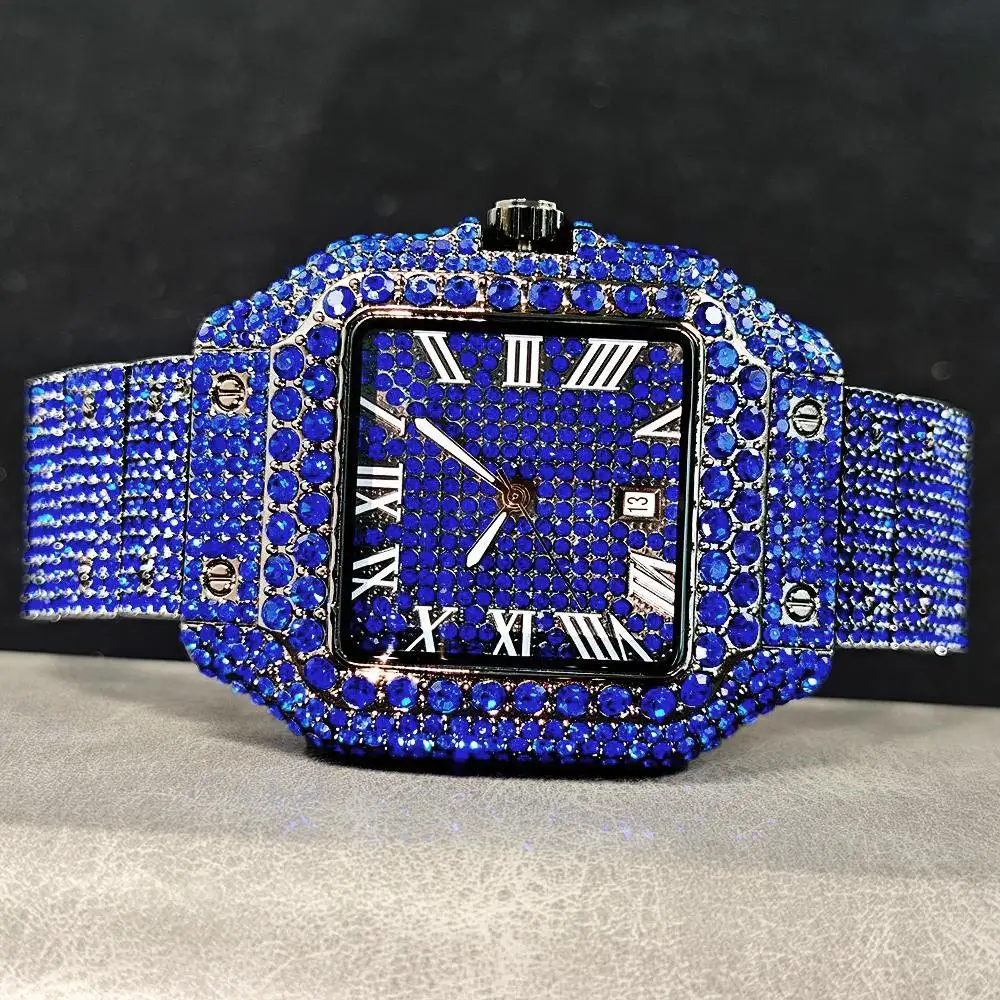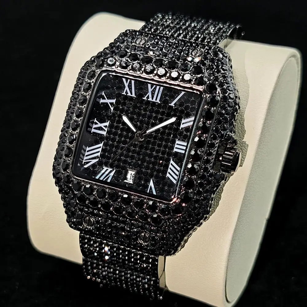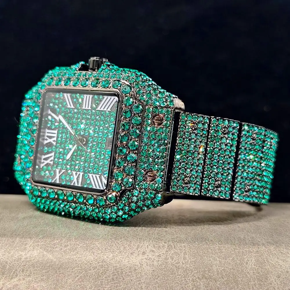 Green Diamond Watch For Men Brand UNIGUET Fashion Roman Literal Quartz Clock Man Hip Hop Iced Jewelry Square Wristwatch 2025 New