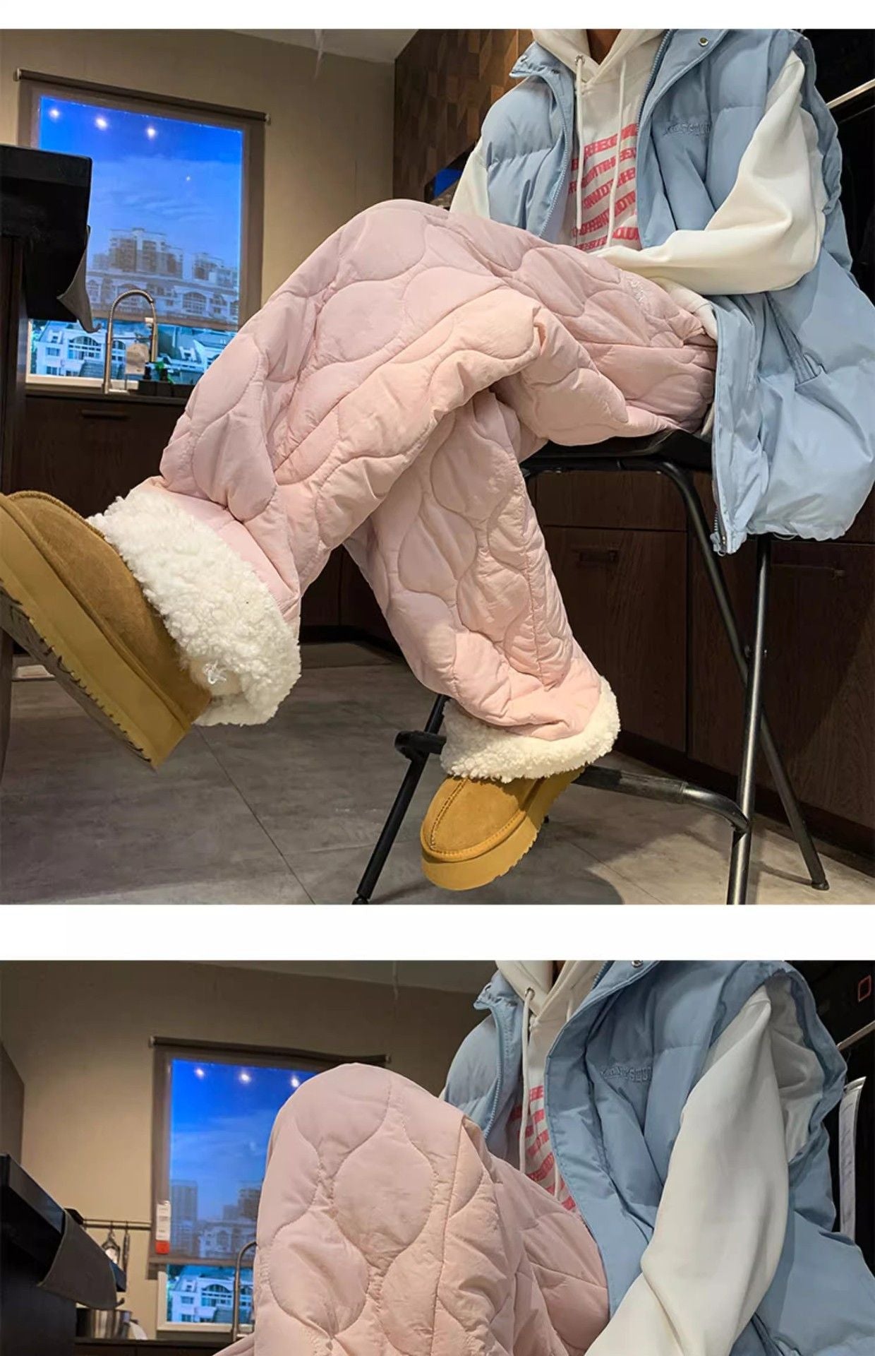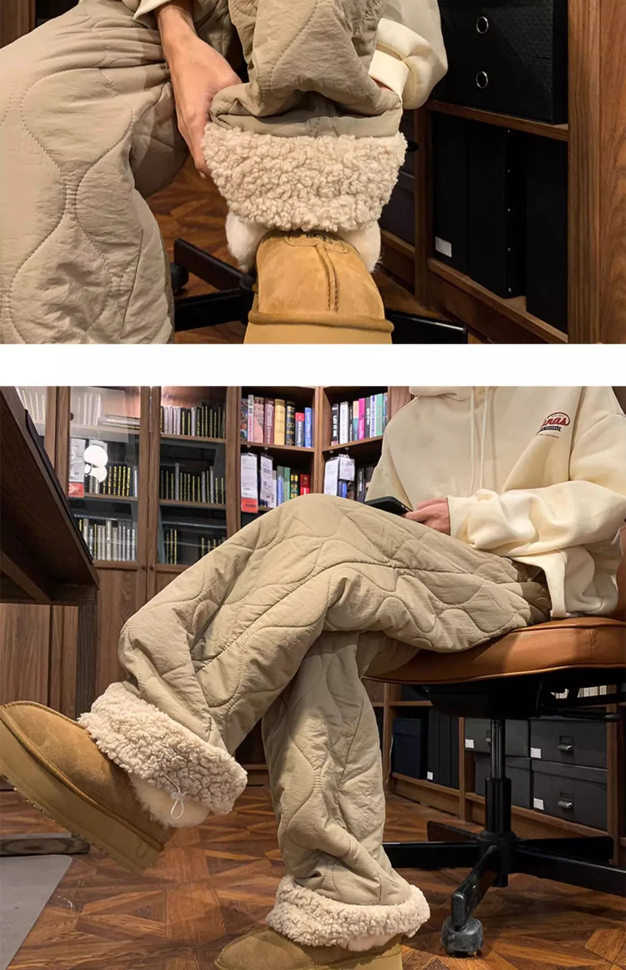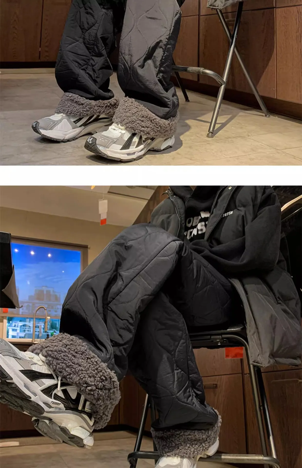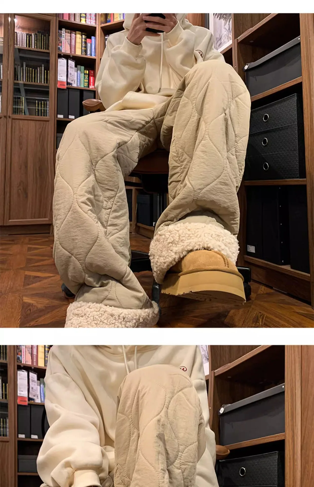 Heavy Winter Cotton Waterproof Splicing Lamb Fleece Cotton Pants for Men and Women, Solid Color Diamond Grid Embroidered Clip Co