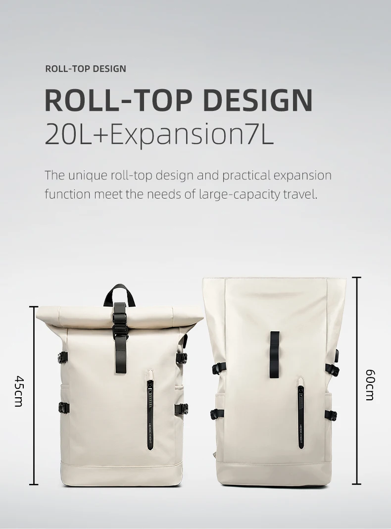The travel backpack has a buckle on its top, you can expand the capacity from 20L to 27L, it is adjustable as you need.