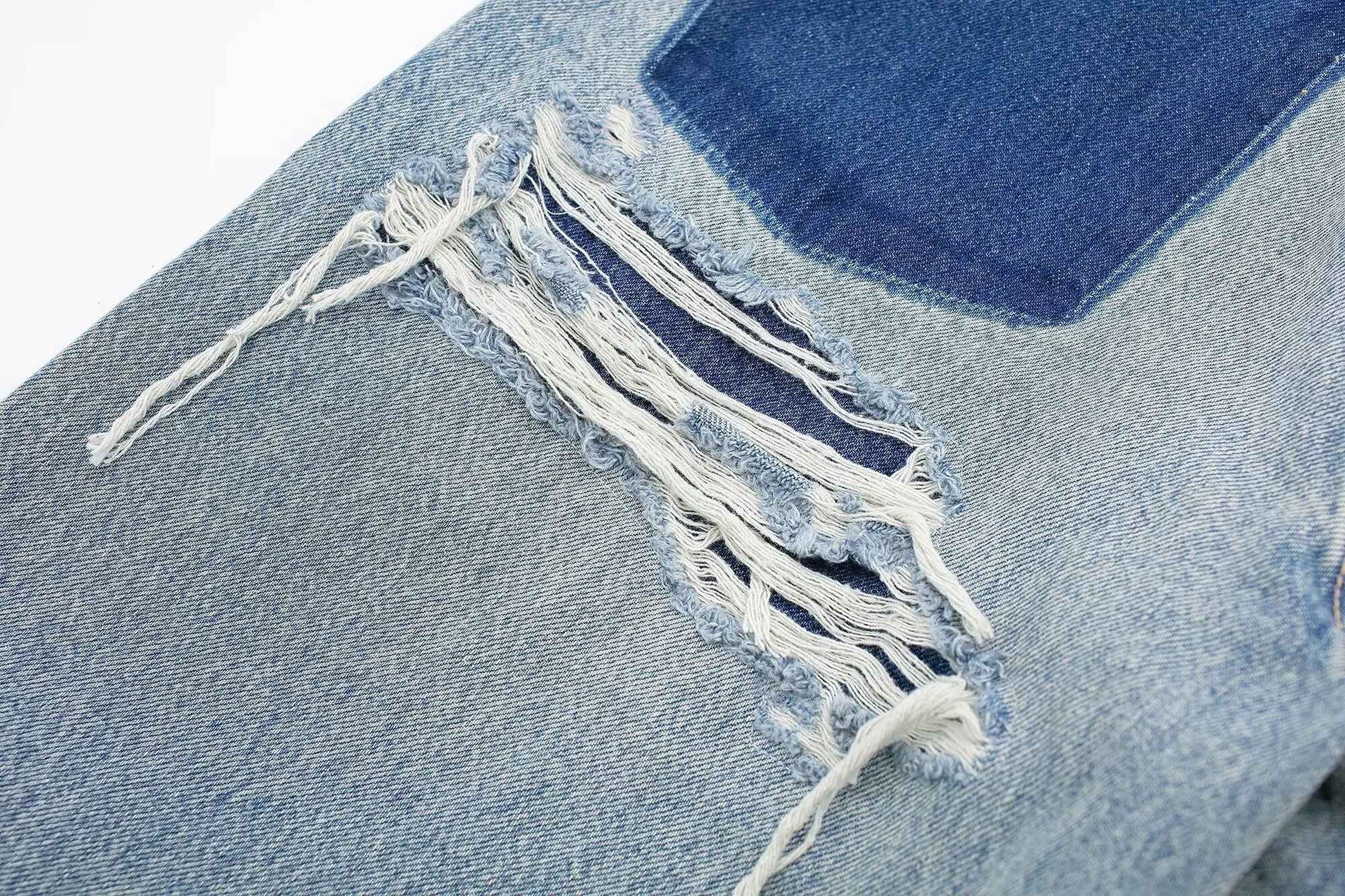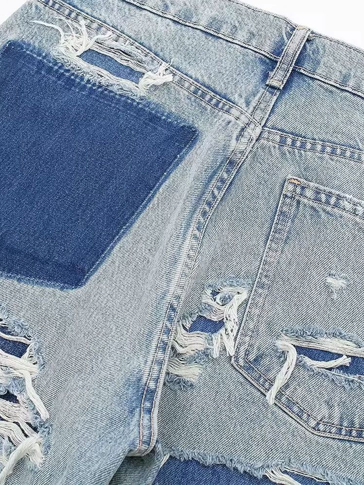 HH 2024 Women's Street Fashion Denim Blue Jeans Distressed Patchwork High Waist Zipper Fly Ripped Retro Long Pants