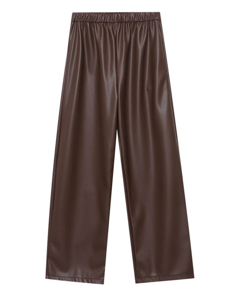 High Elastic Waist Coffee Pu Leather Long Wide Leg Pants New Trousers Women Fashion Tide Spring Autumn