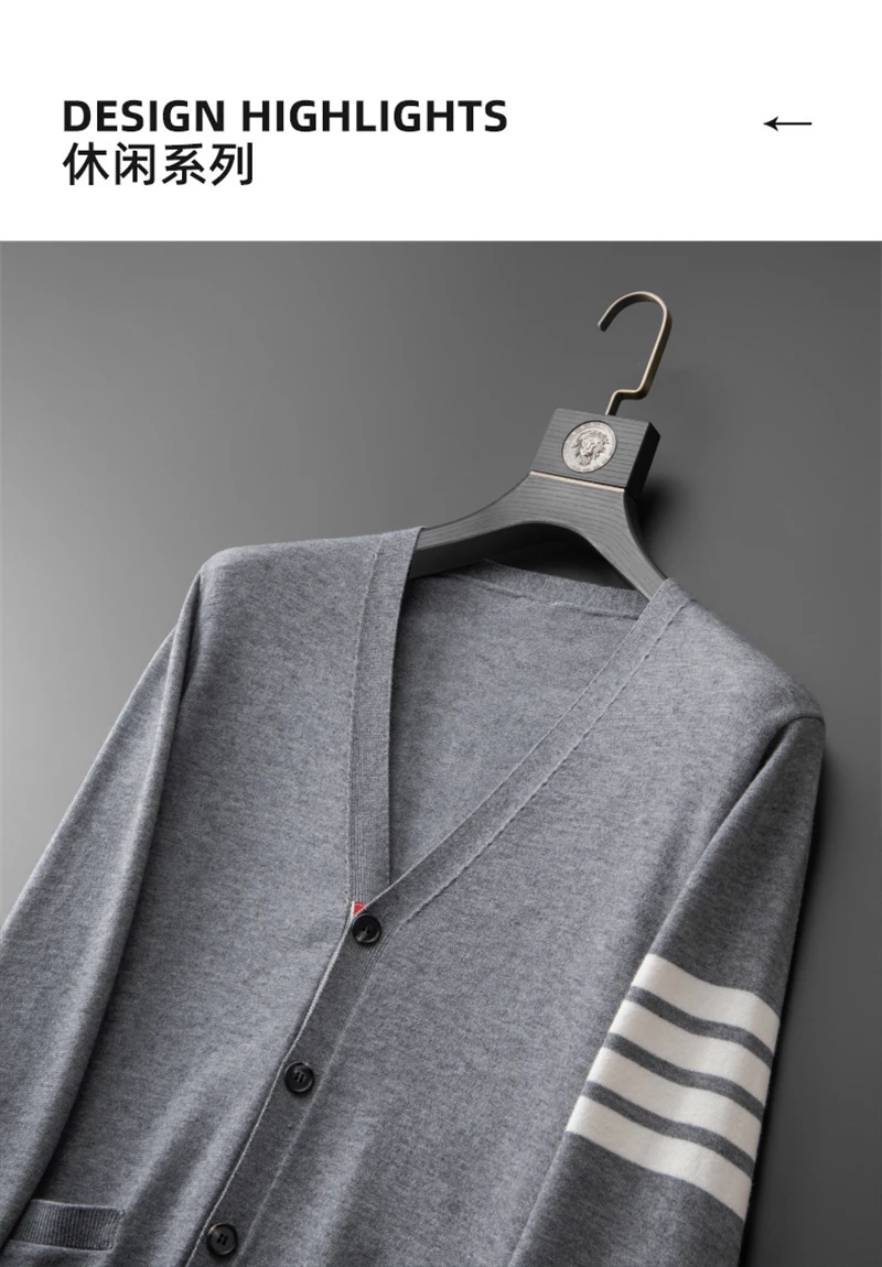 High end brand knitted cardigan men's spring and autumn new classic stripe trend Korean casual side slit V-neck sweater coat