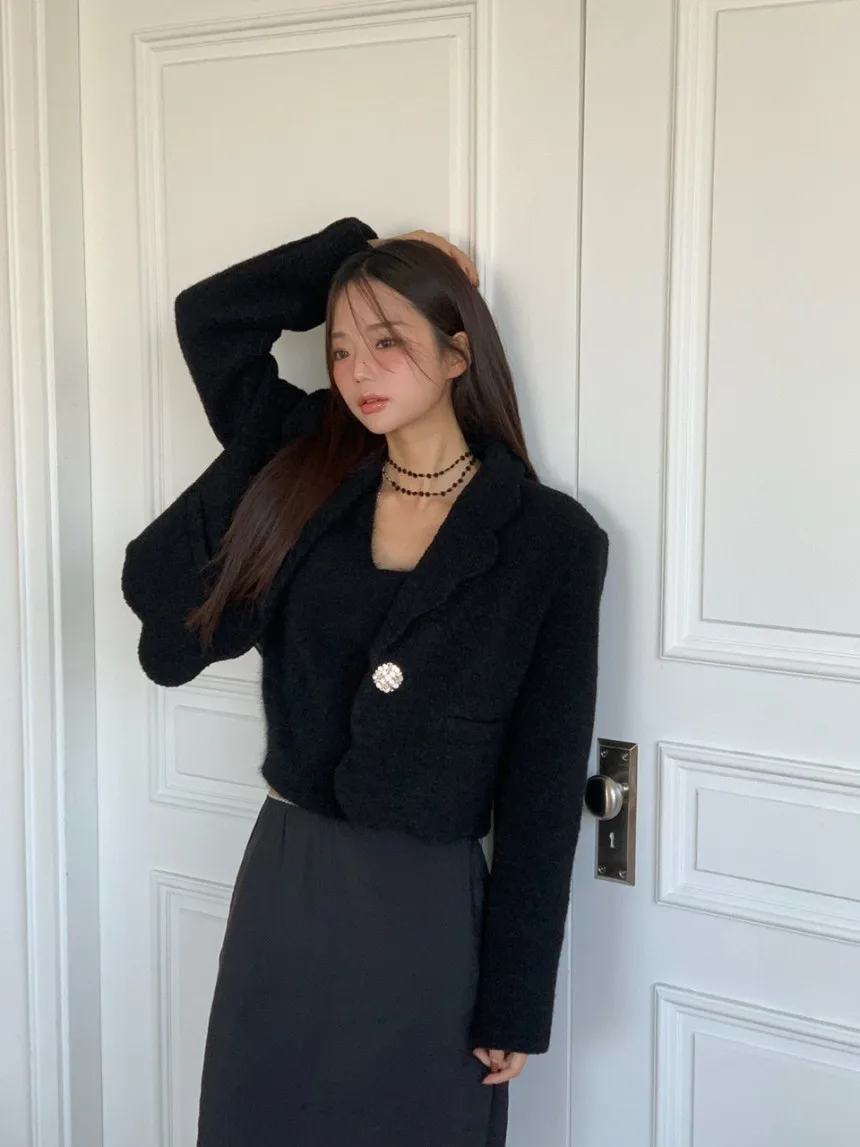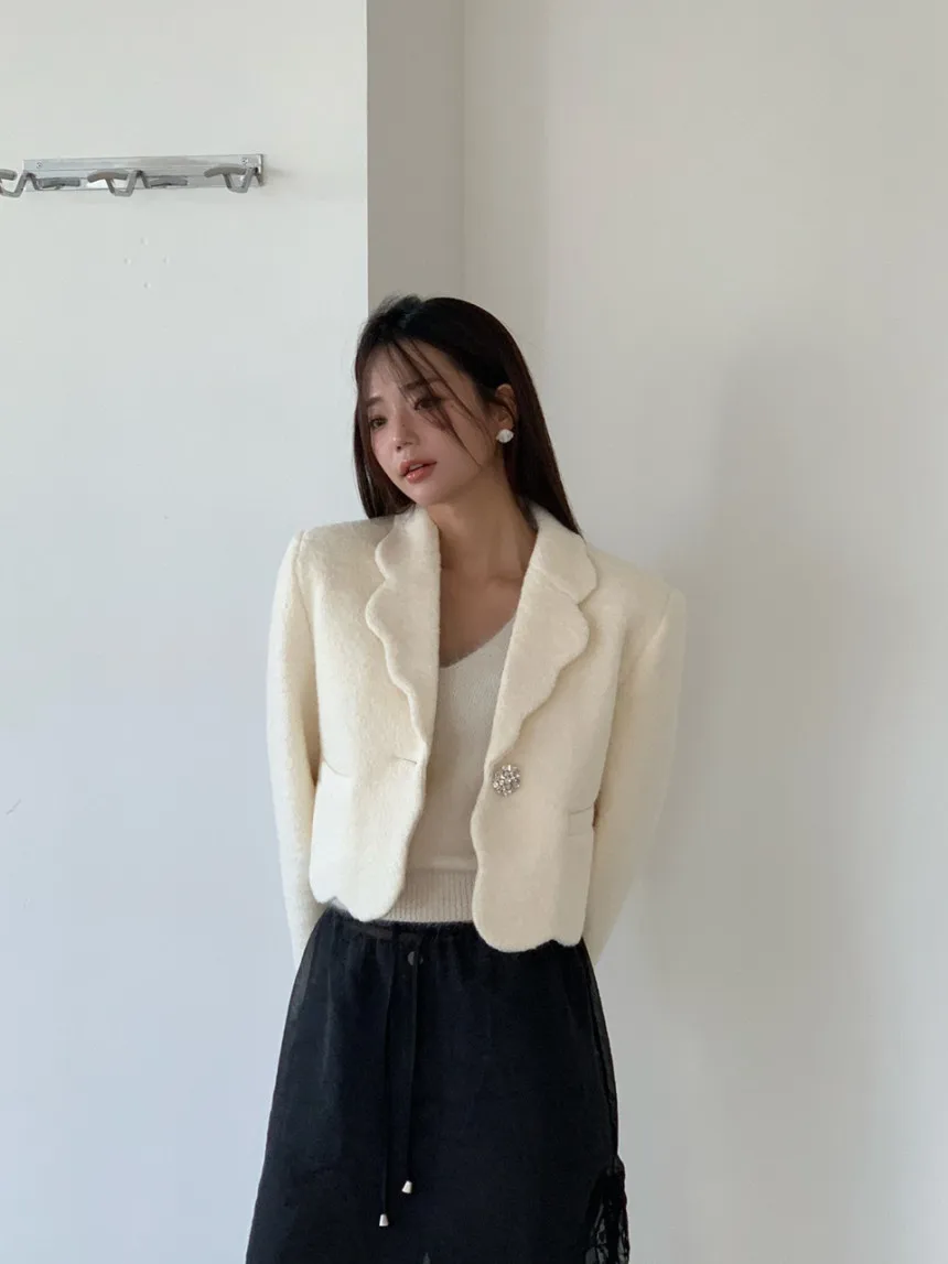 High-end Unique Button-down Woolen Cropped Coat Women Fall Winter Black White Jacket Vintage Design Long Sleeve Coats 2025