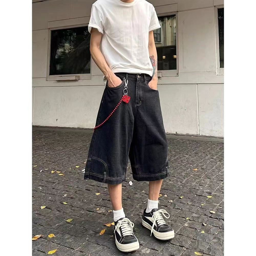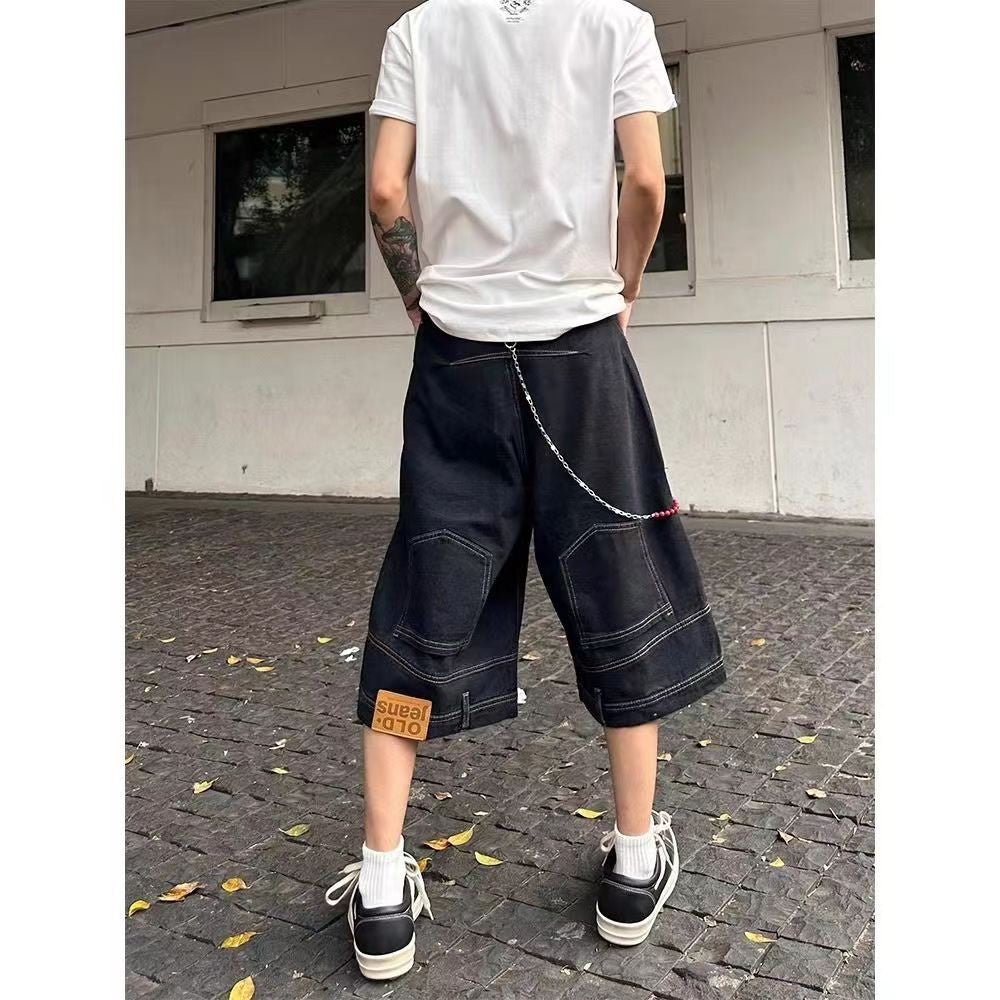 Hip Hop Retro Waist Inverted Design Men Denim Shorts Instagram Gothic Street Apparel Loose Straight Leg Pants Sports Pants