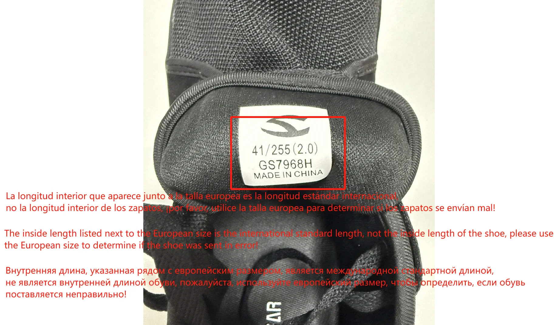 The inner length next to the European size on the tongue is according to the international length as a standard, not the inner length of the shoe, the inner length of the shoe, please take the size chart as a guide, the size information is the inner length, not the outer length. The following sample shoes tongue picture display as a reference, mind do not buy.