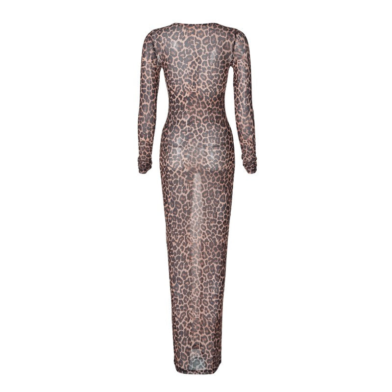 Hugcitar Leopard Print Mesh Long Sleeve Sexy Slim See Through Maxi Dress Fall W