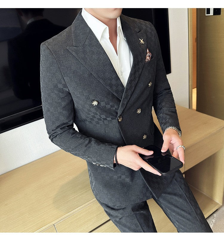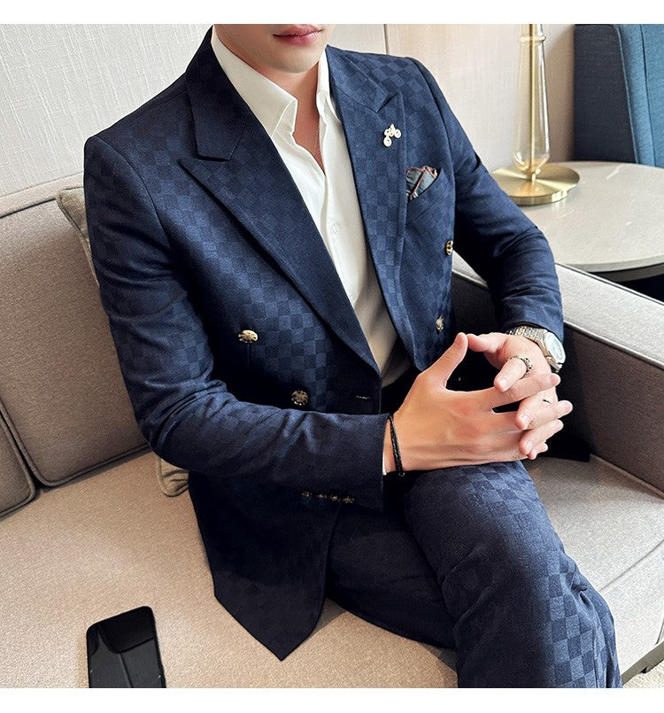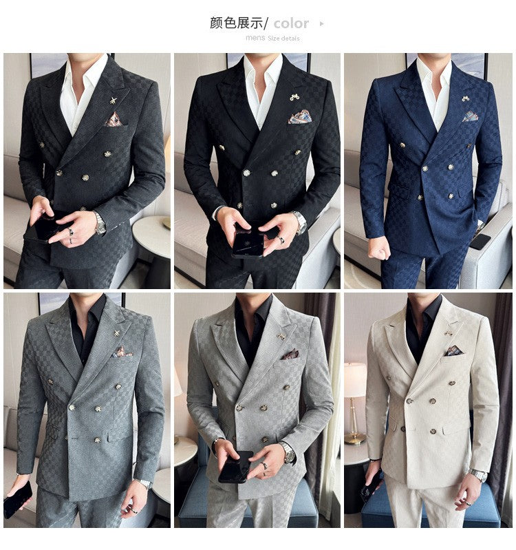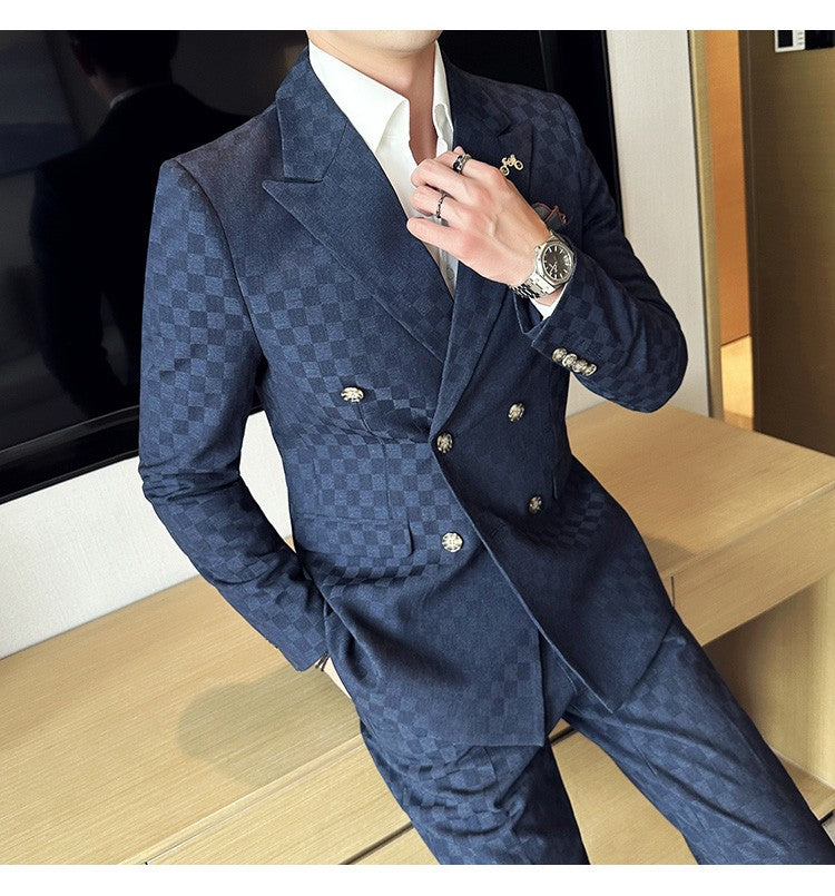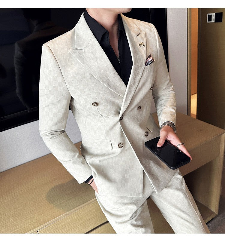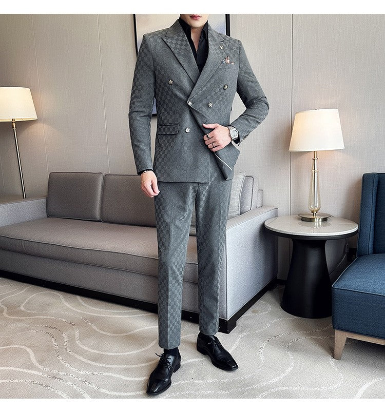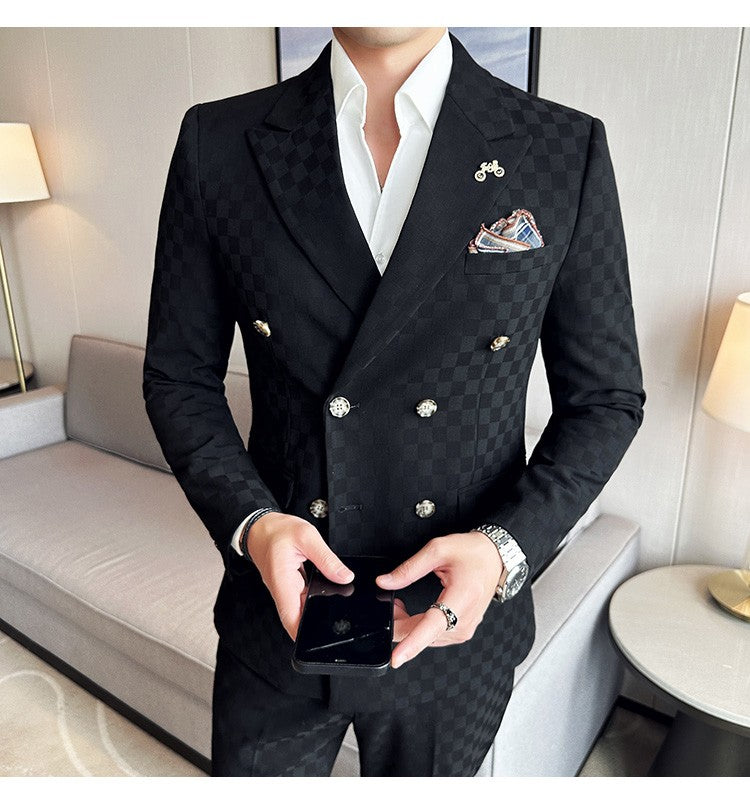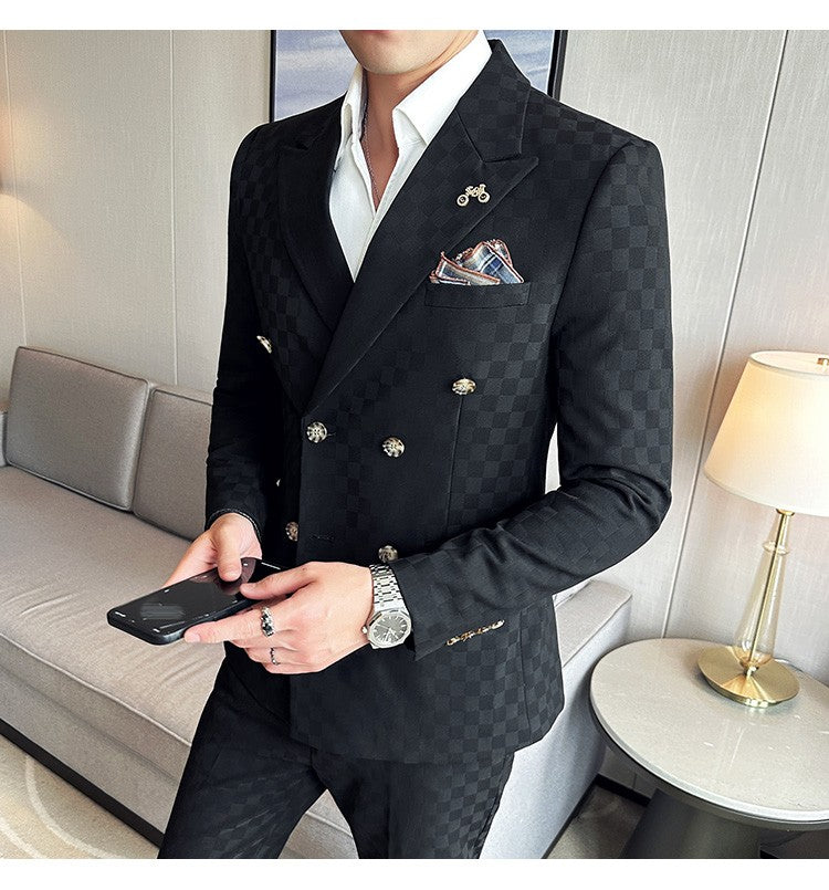 (Jacket+Pants)Luxury Checkered Double Breasted Suit 2 Pieces Fashion Business Slim Fit Social Formal Suit Evening Dress 5XL-M