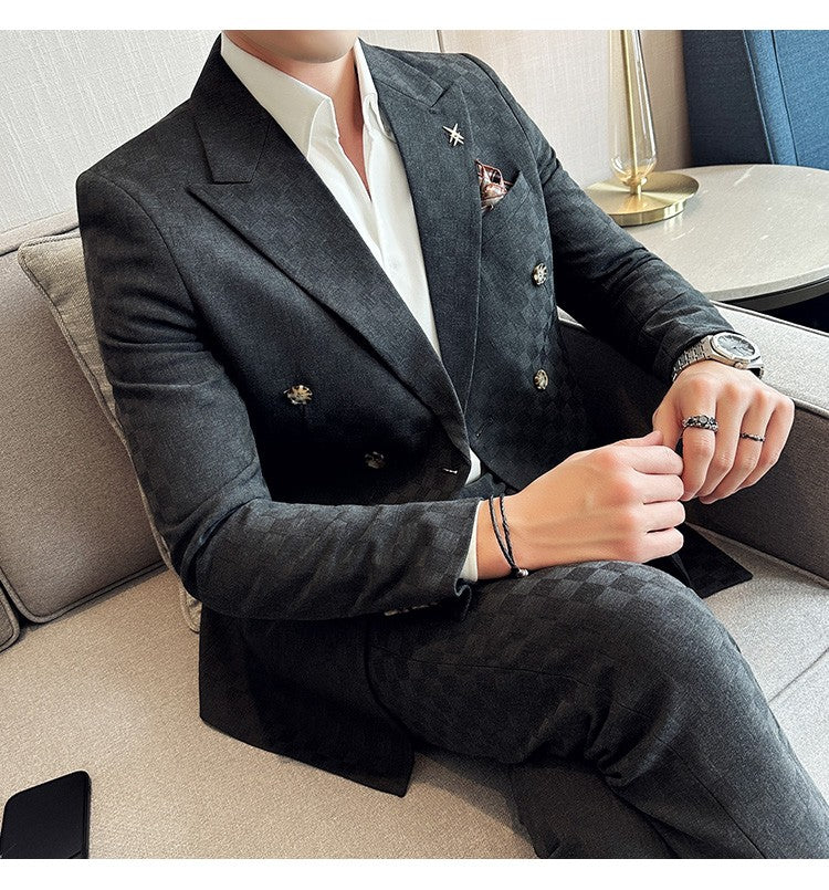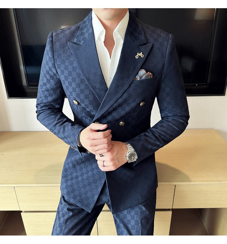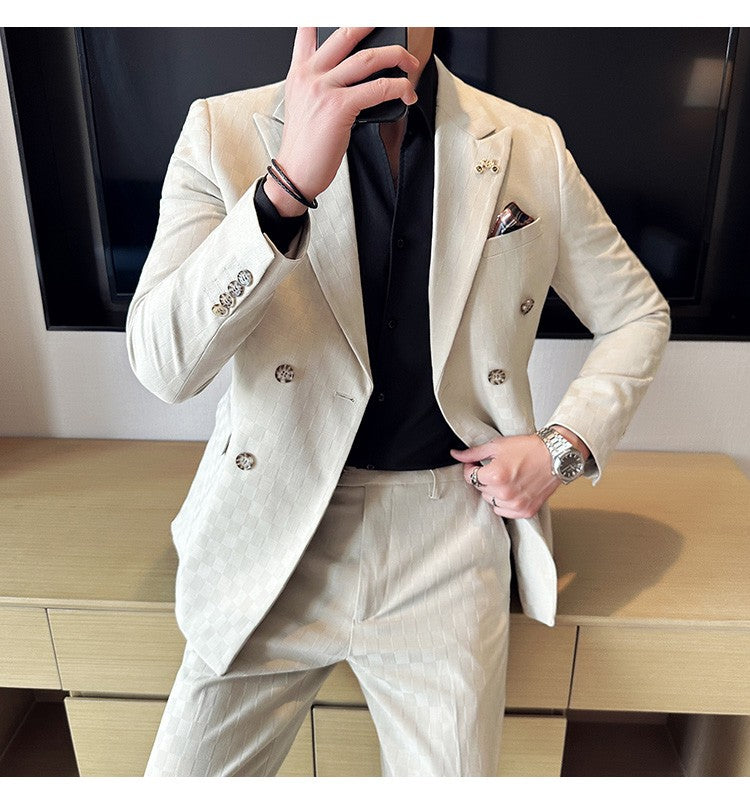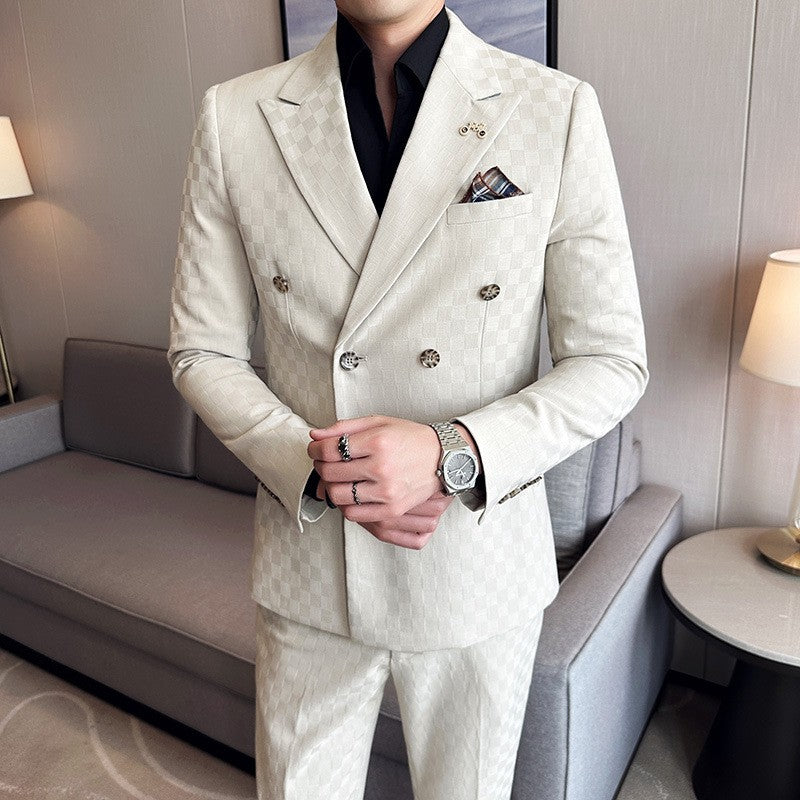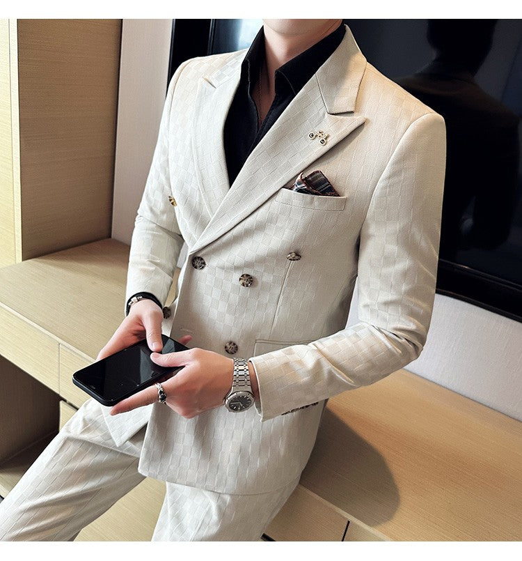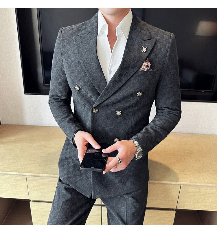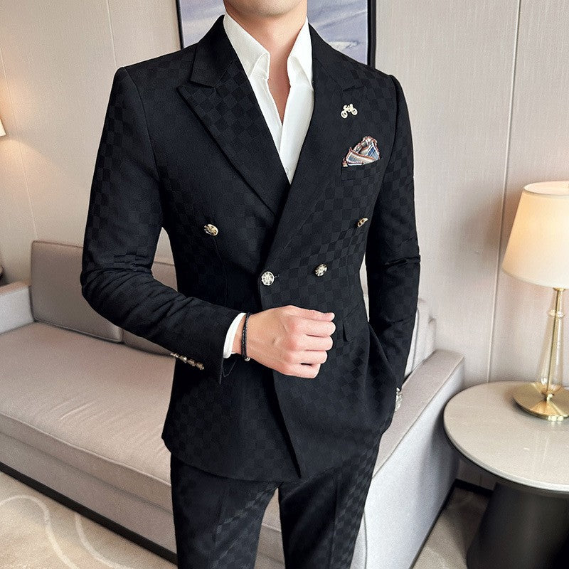 (Jacket+Pants)Luxury Checkered Double Breasted Suit 2 Pieces Fashion Business Slim Fit Social Formal Suit Evening Dress 5XL-M