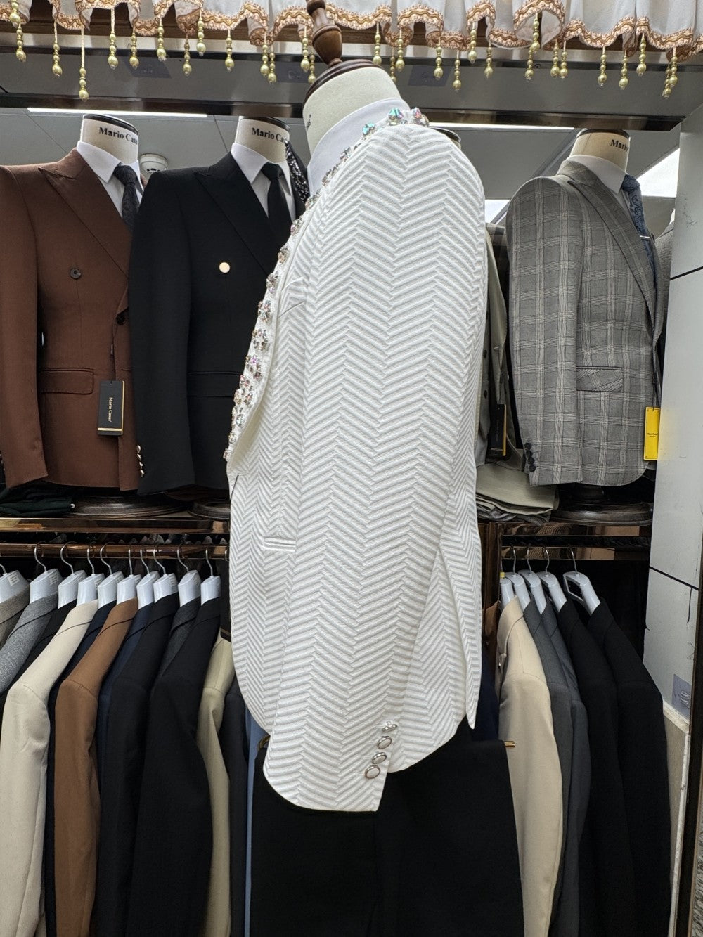 Jacquard Men's Luxurious Crystal Suits 3 Pieces Wedding Groom Sets,White Shawl Lapel Man Tuxedo For Party,Elegant Dancing Set