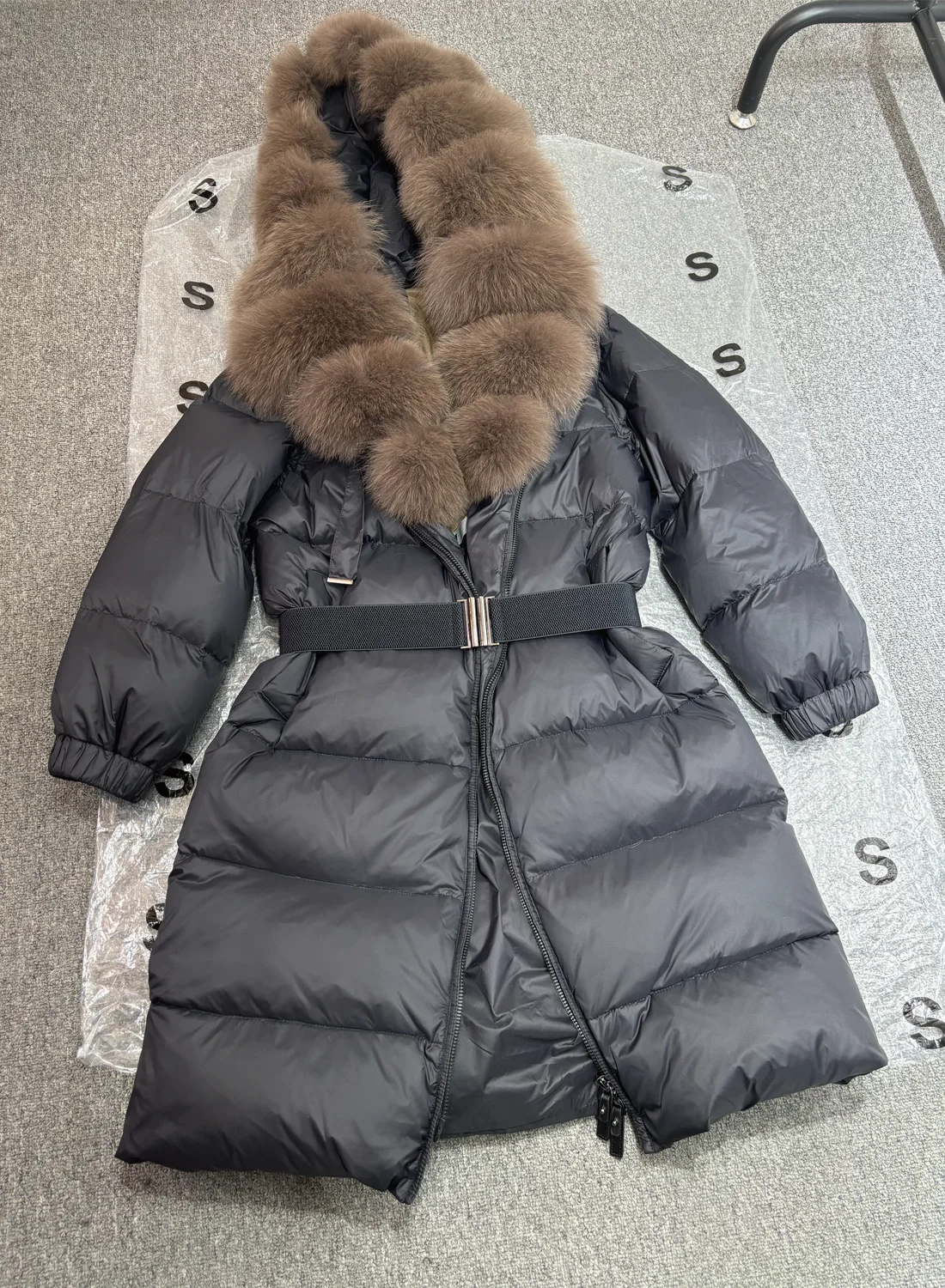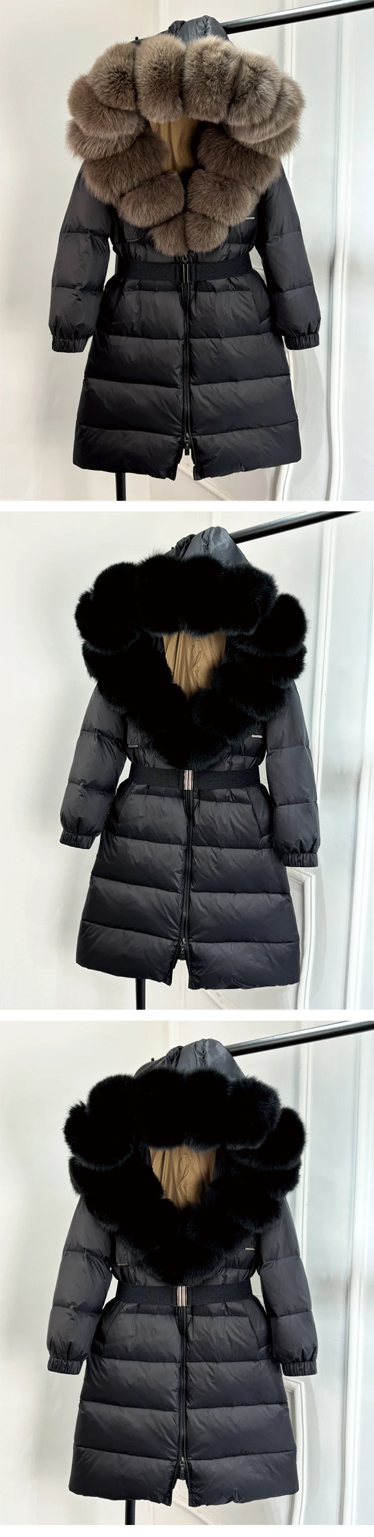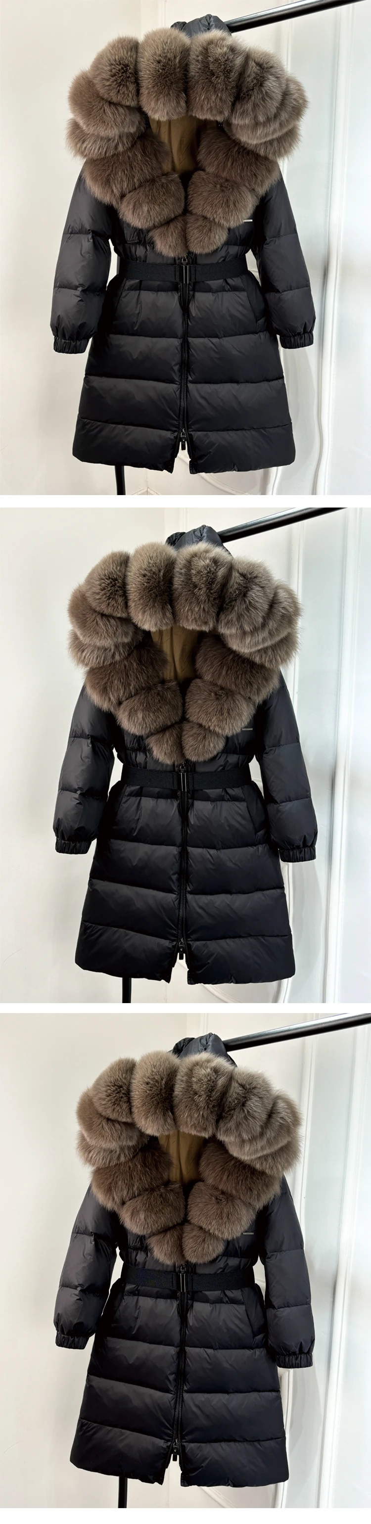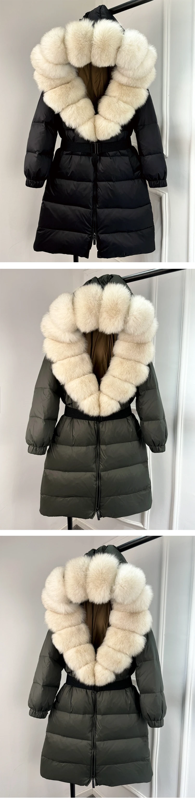 Janveny New Natural Thick Warm 90% White Duck Down Coat Long Winter Jacket Women Real Big Fox Fur Collar Belt Loose Puffer Parka