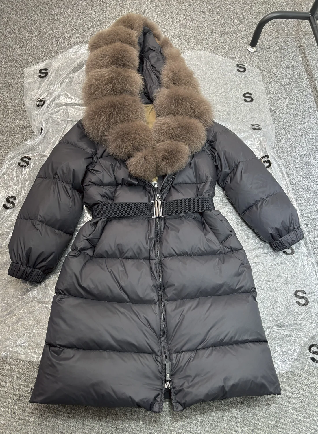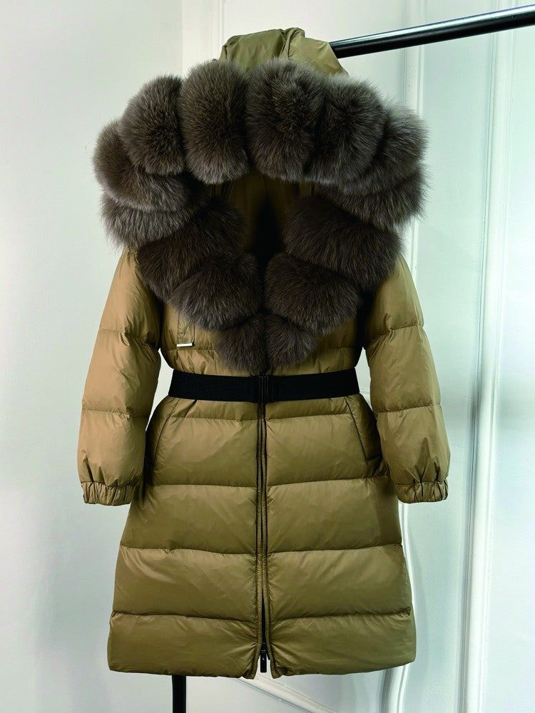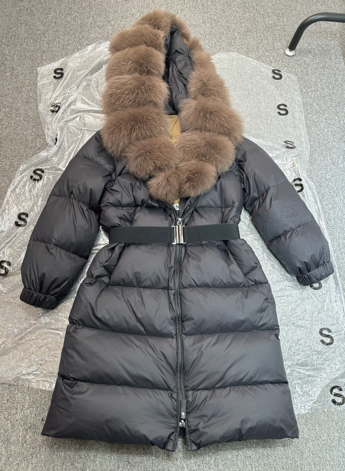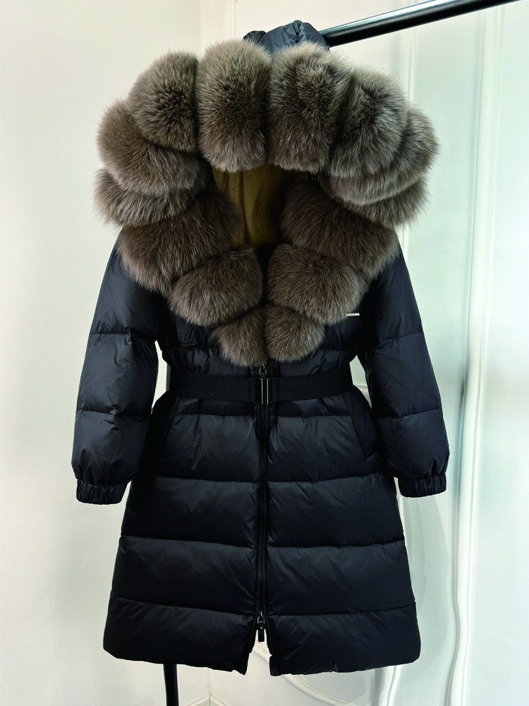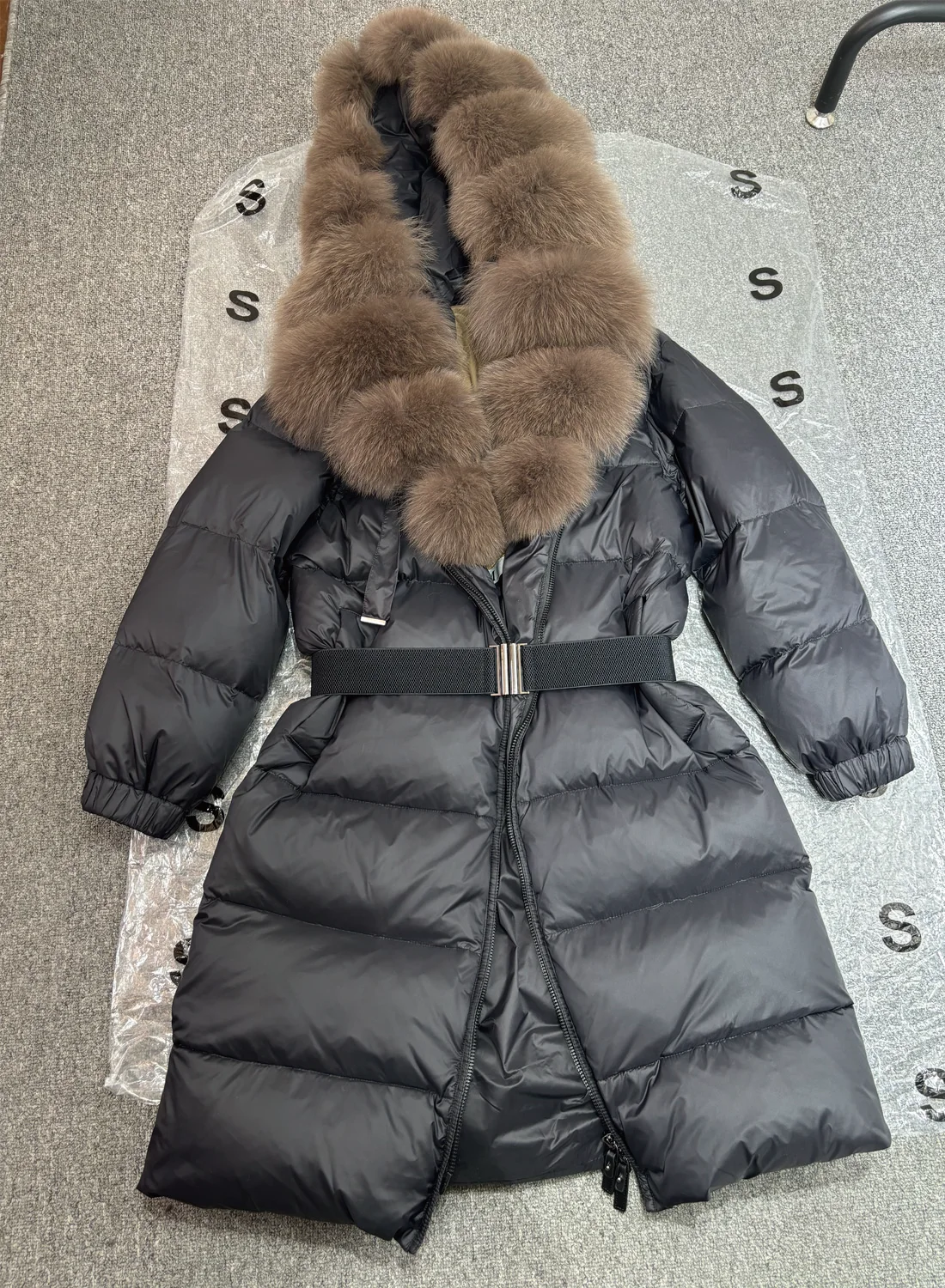 Janveny New Natural Thick Warm 90% White Duck Down Coat Long Winter Jacket Women Real Big Fox Fur Collar Belt Loose Puffer Parka