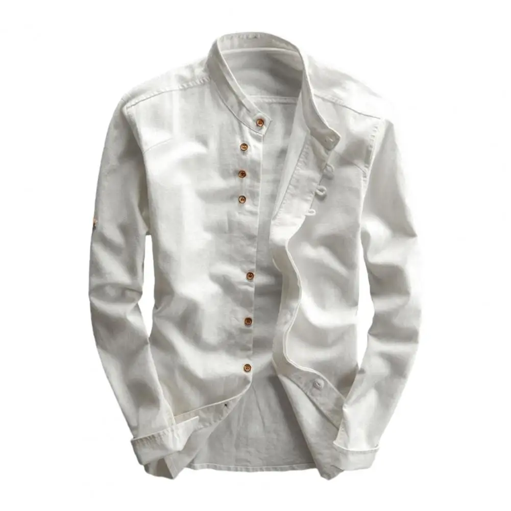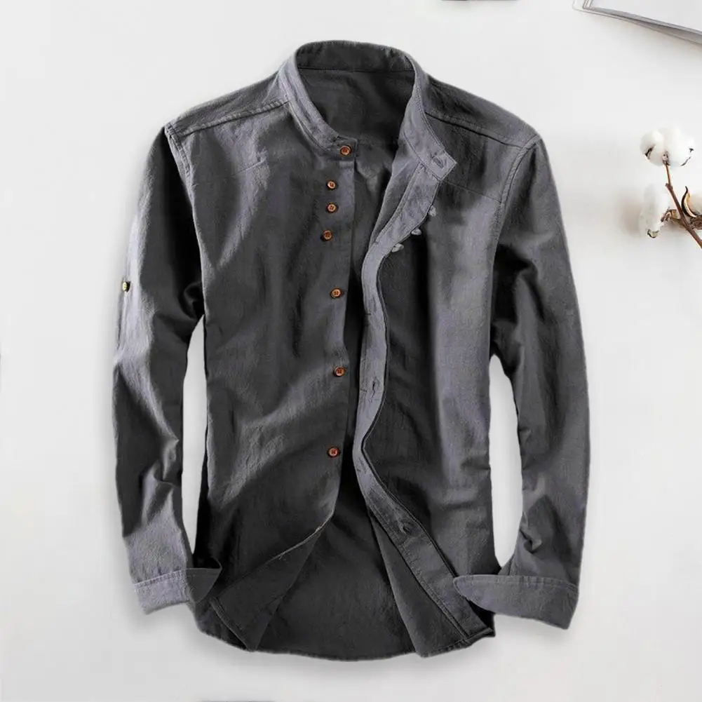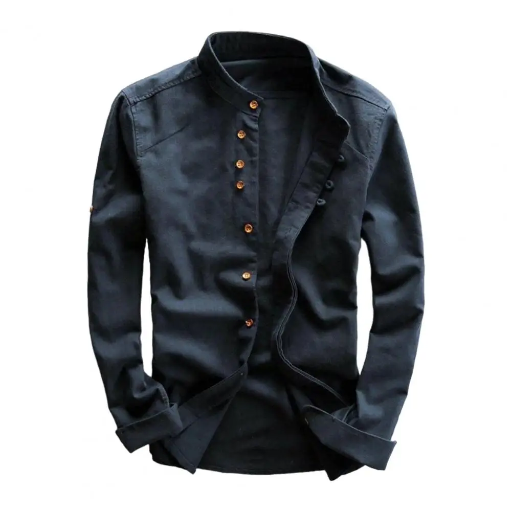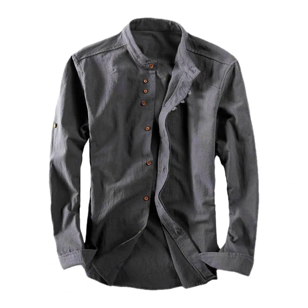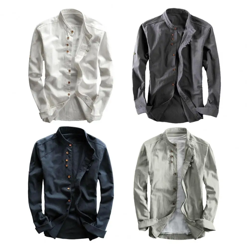 Japan Style Men Cotton Linen Shirt Long Sleeve Slim Fit Single-breasted Cardigan Shirt Harajuku Stand Collar Men Casual Shirts