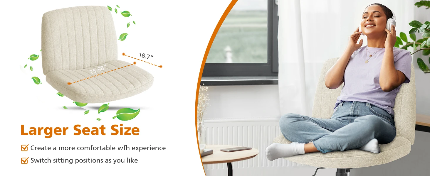 ?Wide Desk Chair?Experience spacious comfort with a seat width of 25.2'' and seat depth of 18.7''. This criss cross desk chair allows you to maintain proper posture or sit cross-legged, easily adjusting to your most comfortable position at any time.
